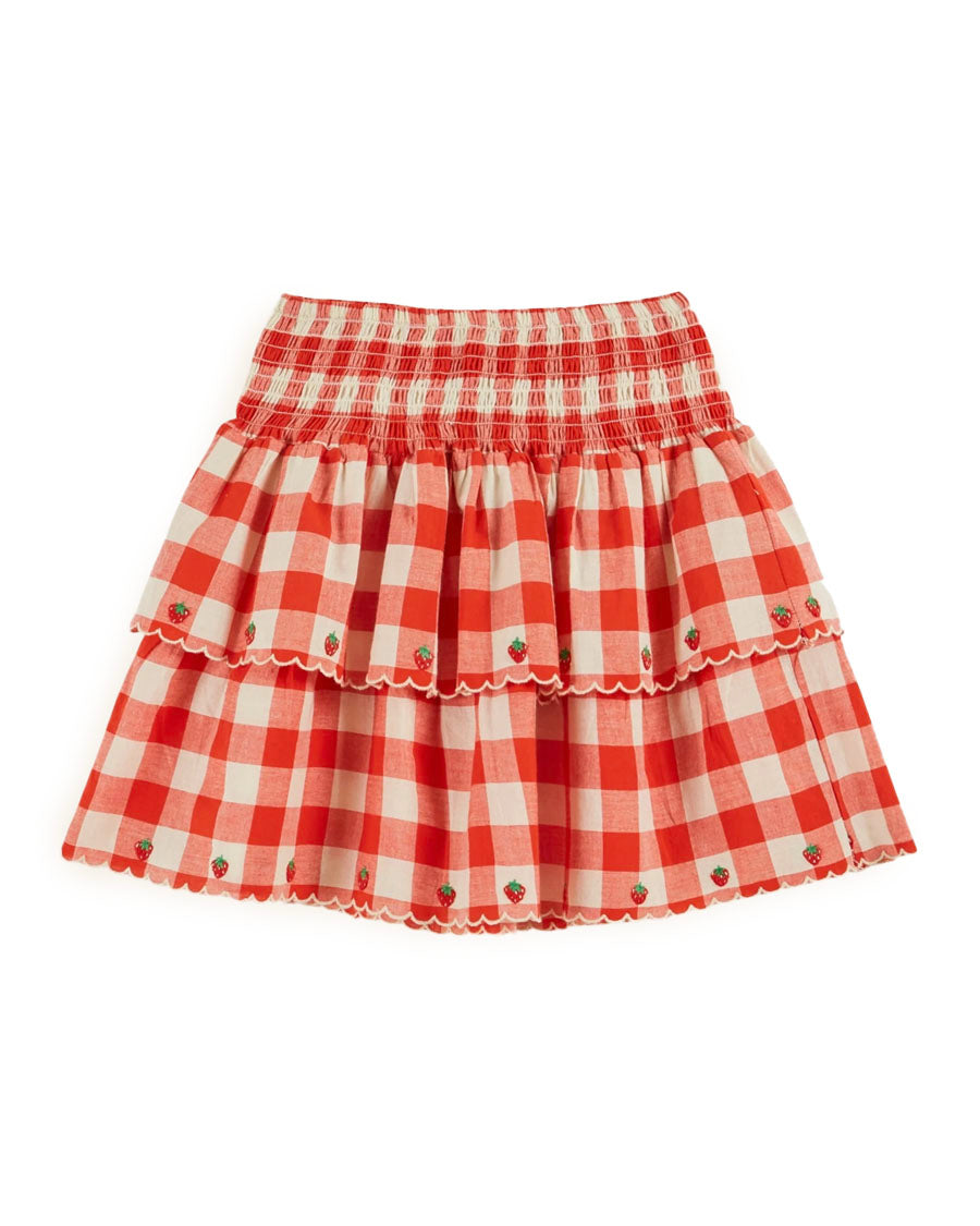 Embroidered Strawberries Tiered Skirt - Red Gingham