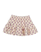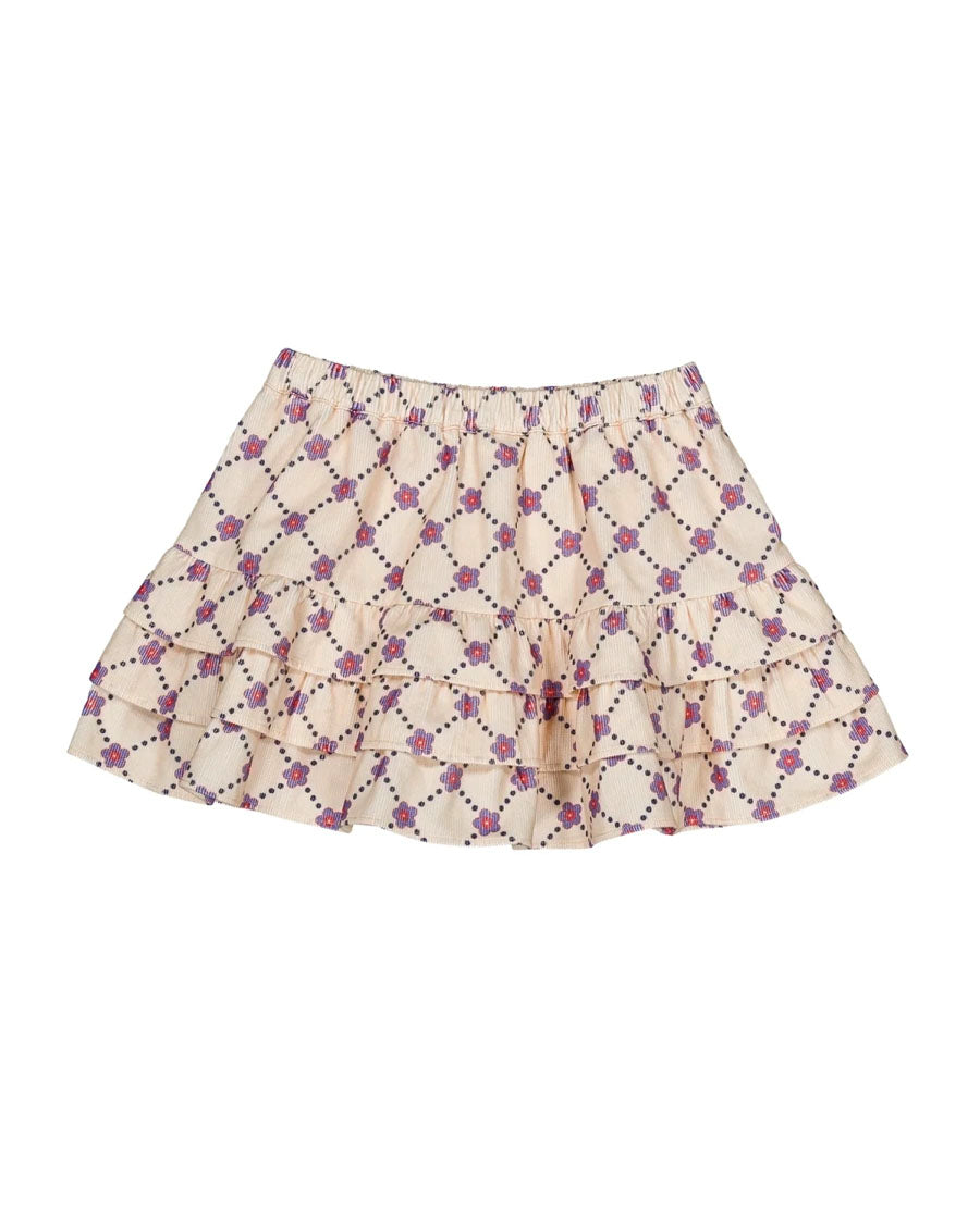 All-over print on baby corduroy skirt with bloomer lining below. Elastic and ruffled waistband. Voluminous gathered skirt with 3 ruffles at bottom.