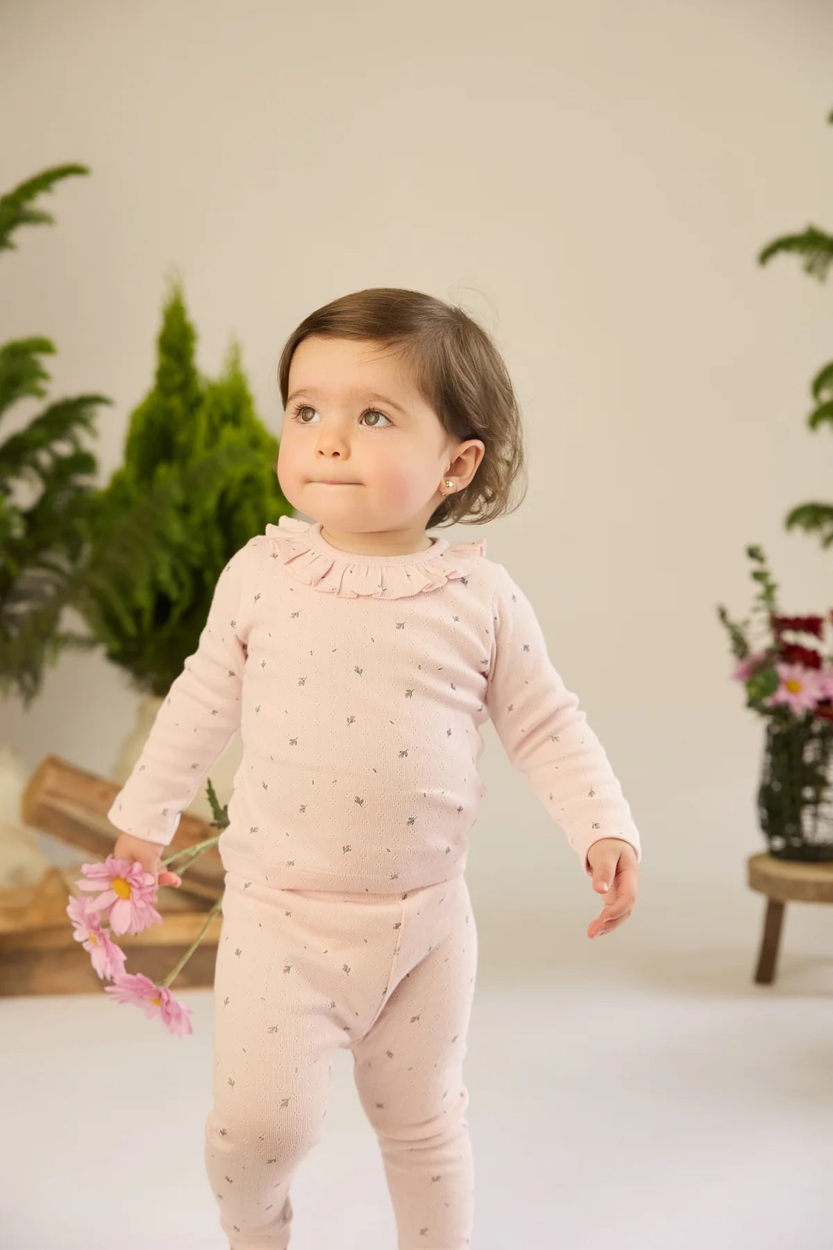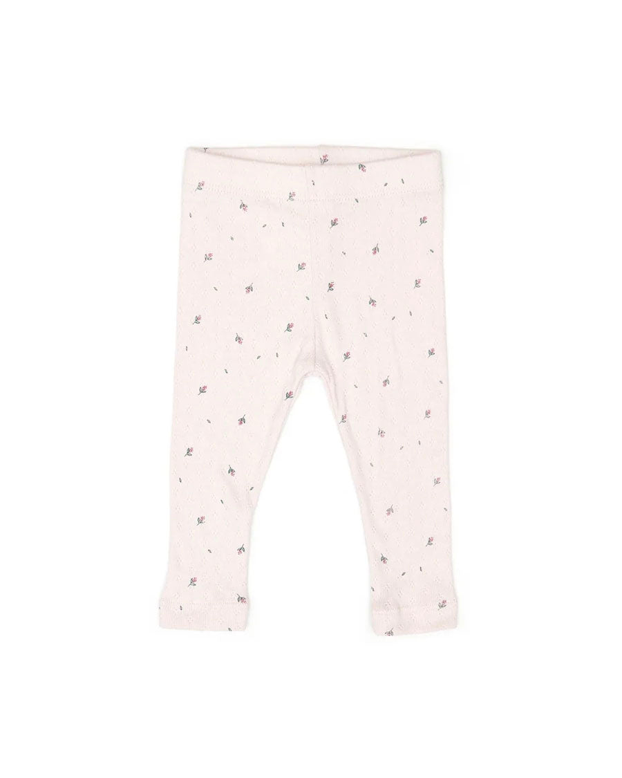 Pearl-colored pants with a delicate floral print, crafted from 100% cotton, known for its softness and durability. The charming design and soft tones make it a perfect choice for any occasion.