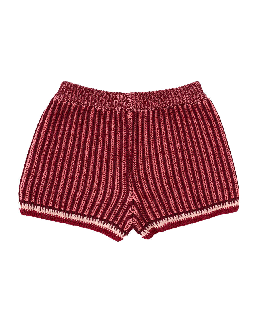 The Mahon Kids Knit Short in Red Stripe from our Summer Swim 2026 Collection. A kids cotton short featuring an elasticated waistband and contrasting stripes throughout.