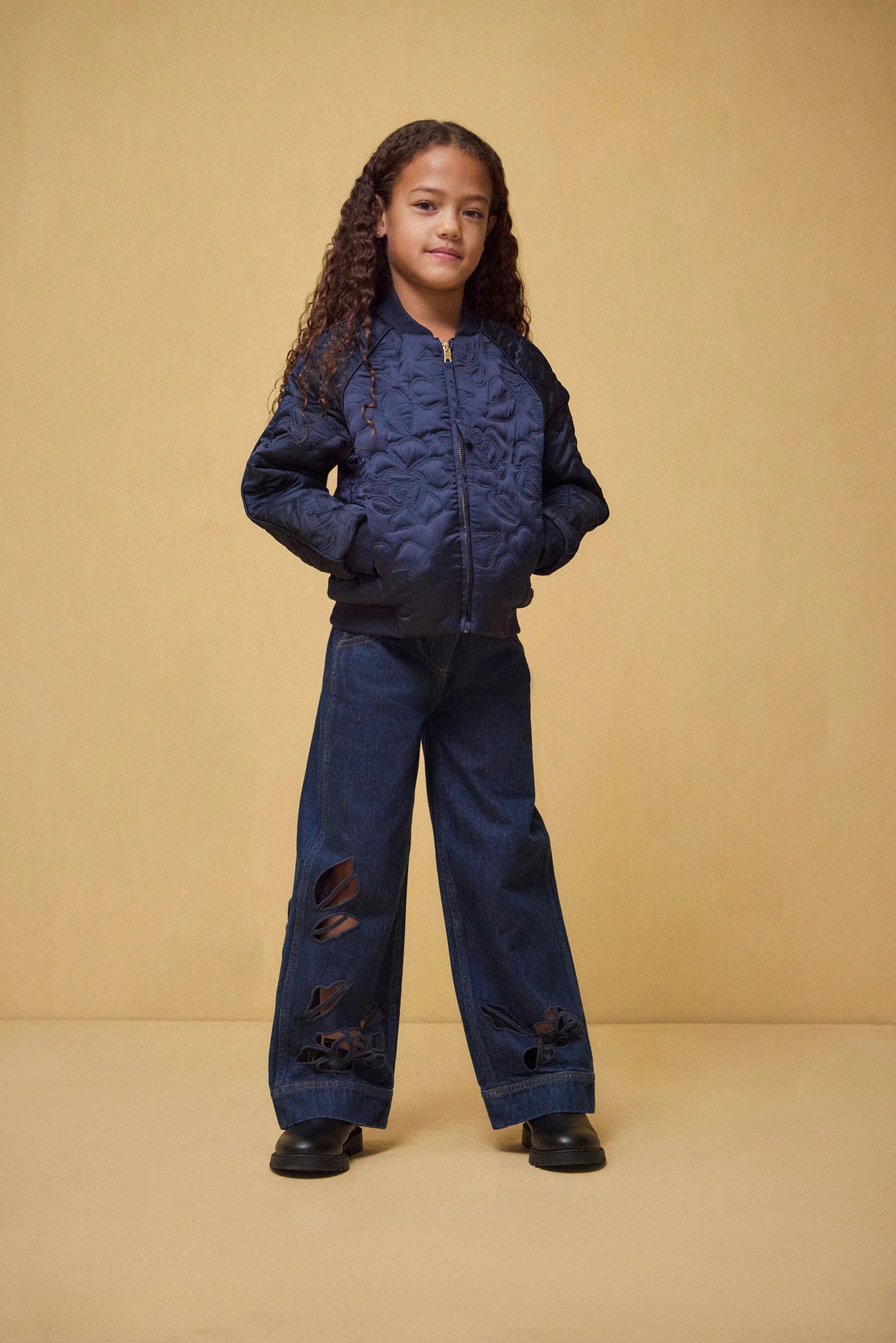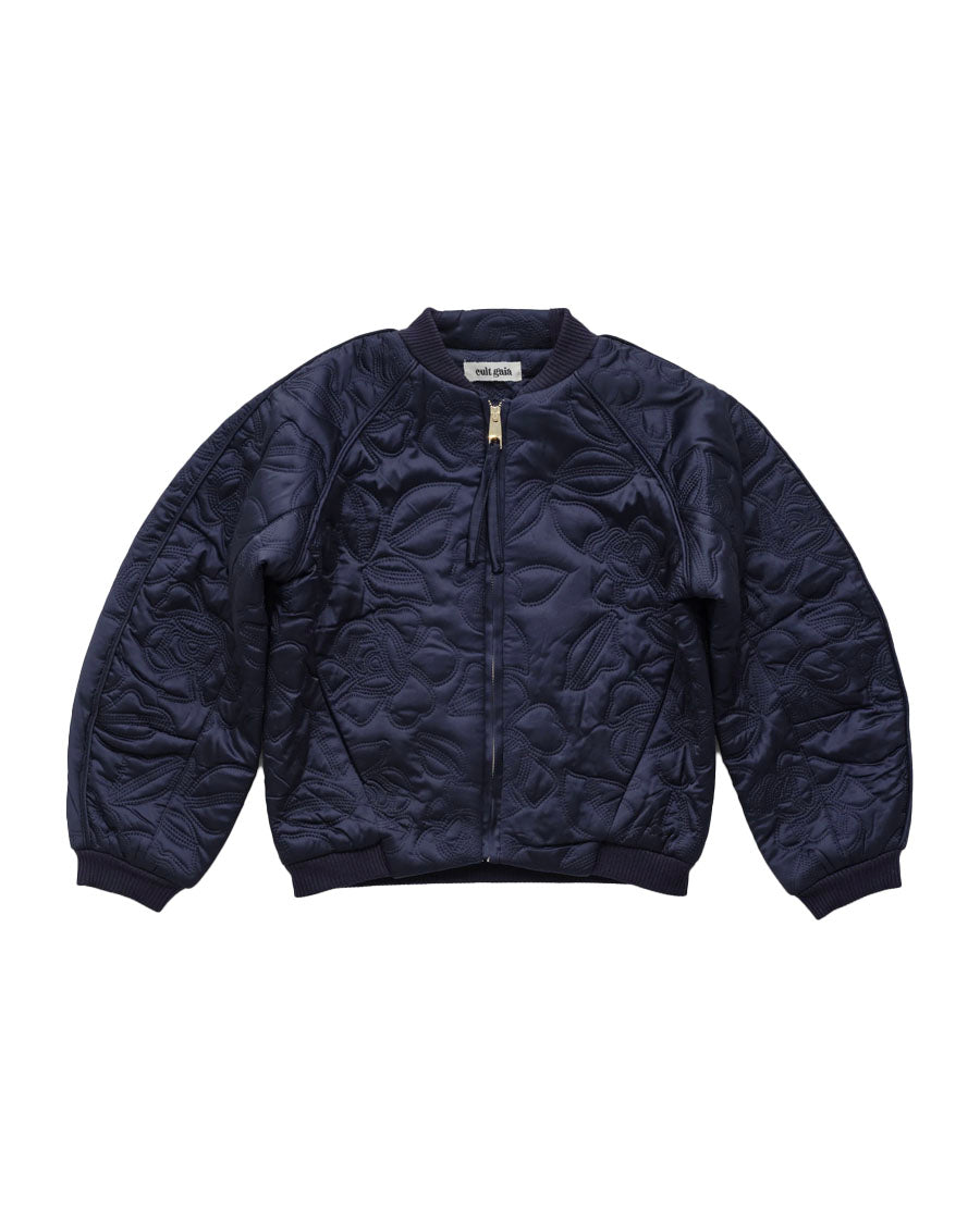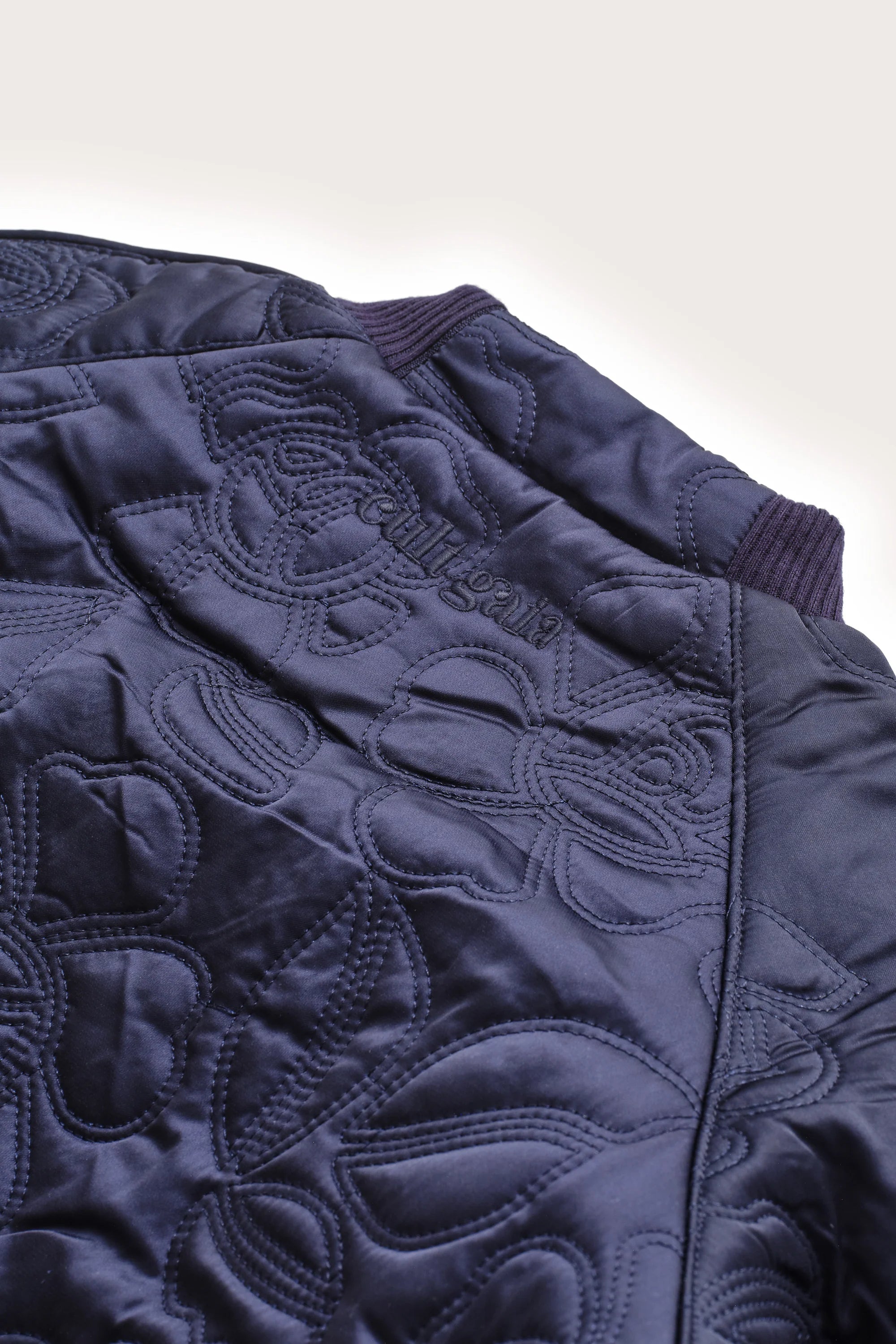 A satin bomber jacket featuring a quilted floral pattern and subtle sheen.