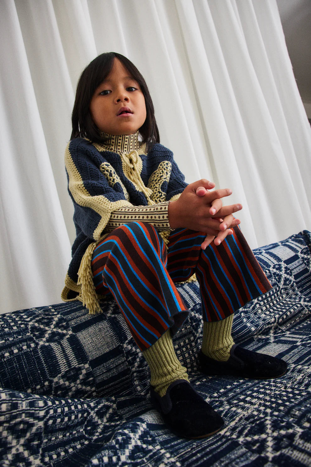 A hand-crocheted, vintage-inspired poncho in Merino wool, featuring a placket with lace-up tie tassel closure and tassel fringe trim. Finished with large hand-embroidered floral motifs.