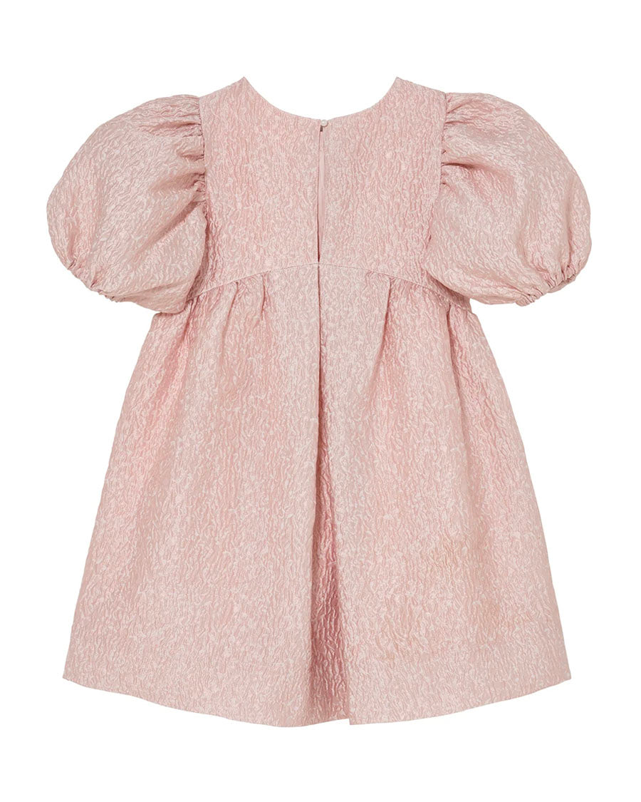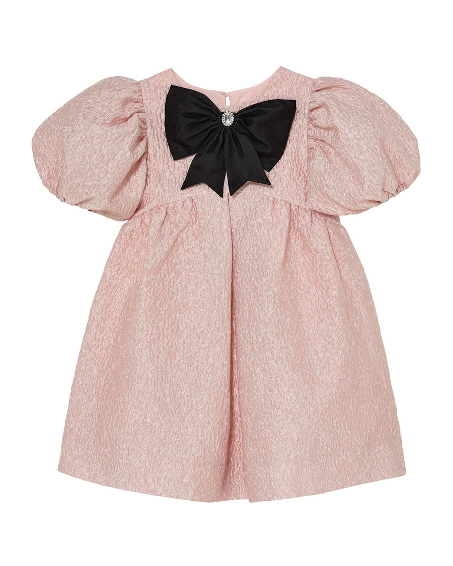 Elevate your style with the Dolly Dress in Heavenly Pink. Designed in a luxurious brocade fabric, this piece showcases intricate woven textures that add depth and sophistication. The softly structured puff sleeves bring a graceful silhouette, while a single statement black bow at the front—adorned with a sparkling gem at its center—adds a bold, contemporary accent. It’s the perfect blend of elegance and standout detail