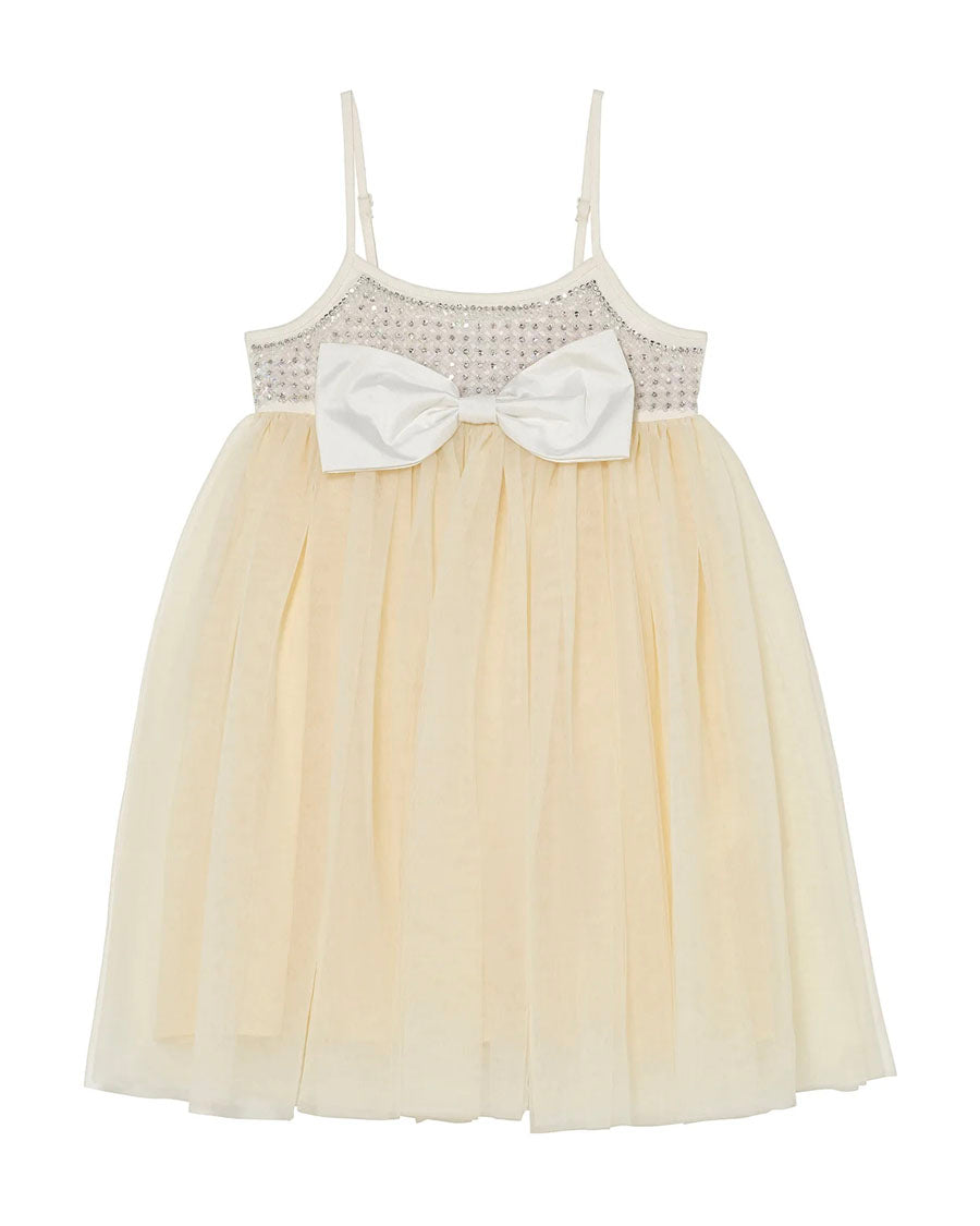 Step into a world of enchantment with the Jolie Tutu Dress, where sweetness meets elegance. This exquisite creation features a lavish full tulle skirt that twirls and sways beautifully with every step. The bodice, a stunning white canvas, sparkles with shimmering crystals that catch the light, while a oversized bow adds a statement of glamour.