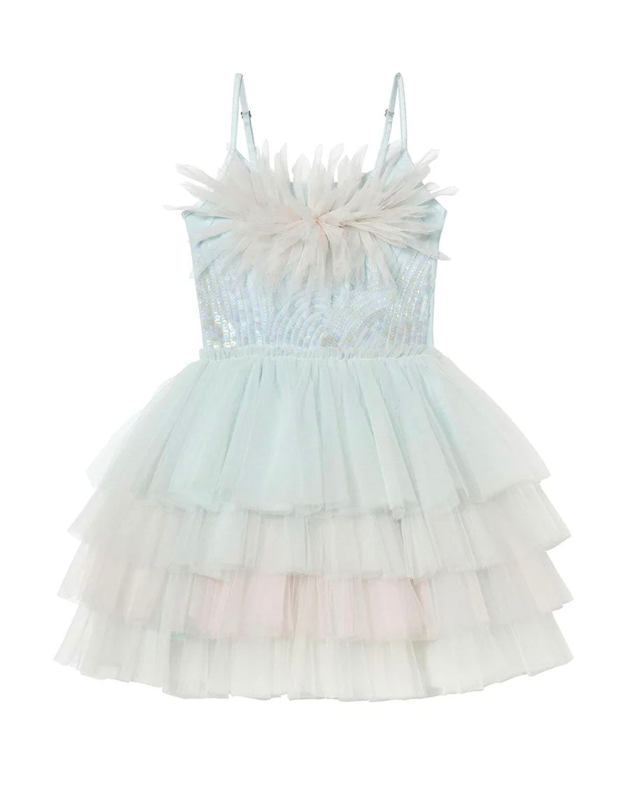 Inspired by the light of the lunar world, the Crescent Moon Tutu Dress in Diamond Blue Mix features tufts of tulle across the neckline of the sequin embellished bodice, supported by adjustable straps for ease. Step into celestial enchantment with a four-tiered, ombre tulle skirt.