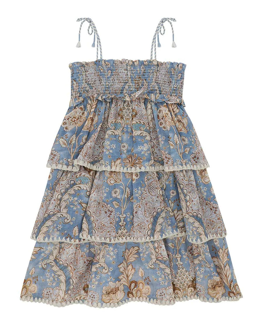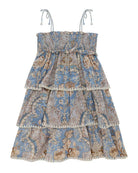 Tiered dress in a bandana blue floral design. Shirred bodice, fixed shoulder strap ties and a tiered ruffled skirt. Composition: Main: 100% cotton; lining: 100% cotton.