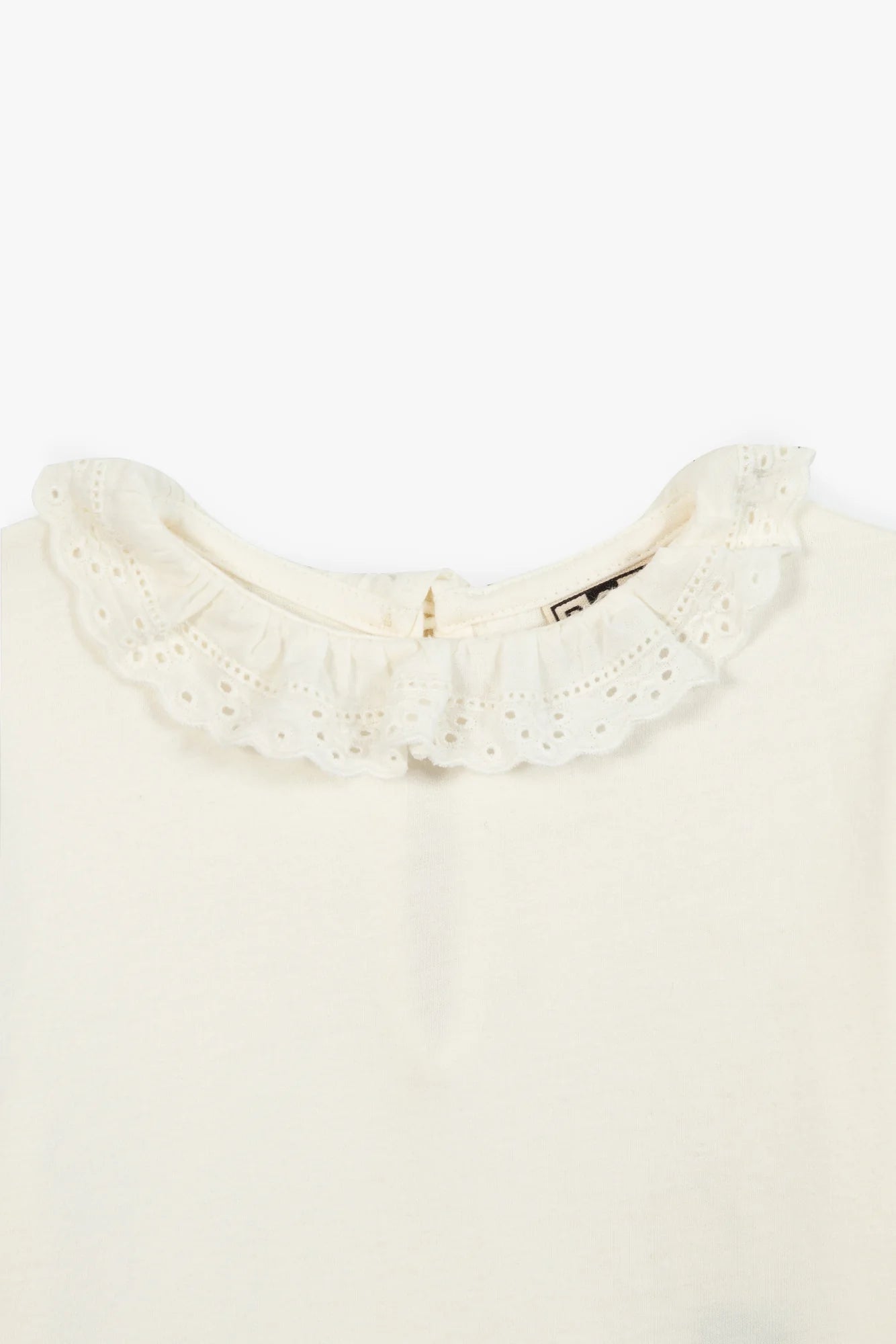 Discover the honey t-shirt from the "New Barn" collection in Écru Bonton, perfect for small budding cowgirls! With its long sleeves and its Ruffled collar Opened, it brings a touch of rustic elegance to each outfit. Elastic wrists add ideal comfort for all adventures. Made of 100% cotton, it ensures softness and freedom of movement for the little ones.