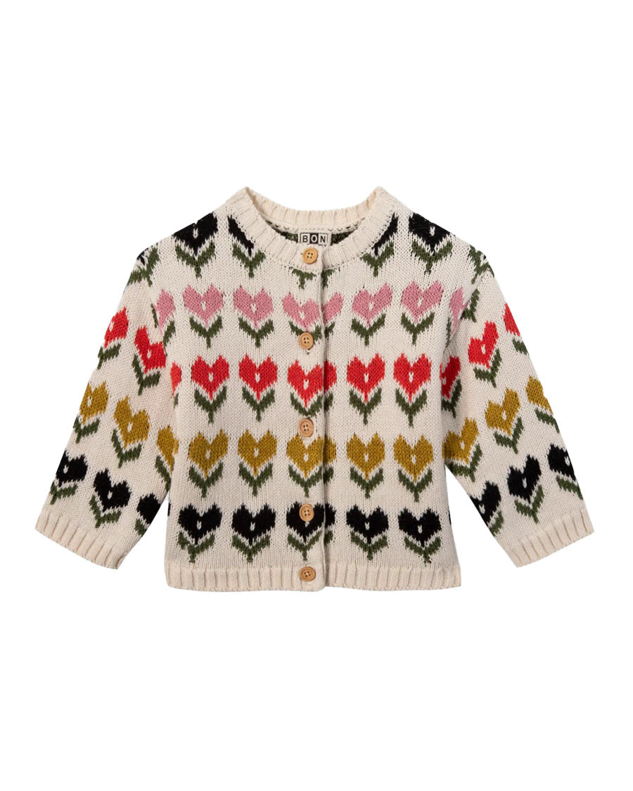 THE Cardigan Maligne, in Ecru Mouton, from the Faroe Island collection, invites to an enchanted walk among the tulips! Adorned with floral patterns, it is perfect for adding a touch of poetry to the days of small adventurers. Made of 100% cotton, it promises softness and comfort. With its Button charming, he slips on a Dress or a Trousers For a delicate and chic look!