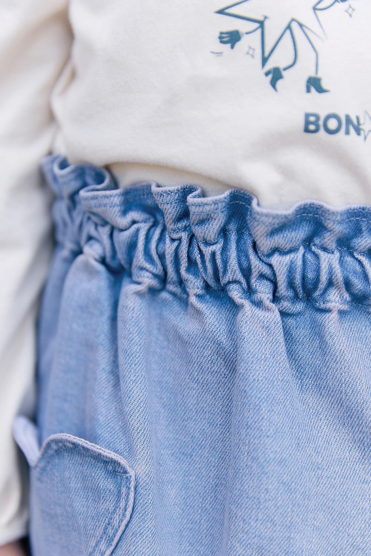 There Skirt Douchka in Bleached denim from the "Winter Tales" collection is a winter dream for little fashionistas! With its elastic waist and heart -shaped panels, it is perfect for twirling in the snow. Its faded effect double dye Pink Add a touch of magic to each movement. To associate with Tights Colorful for a stylish adventure!