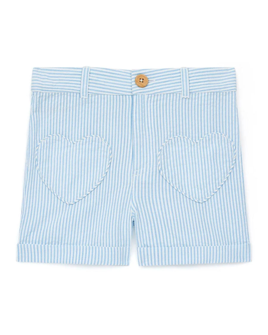 Super cute summer seersucker cotton shorts embellished with soft blue stripes. We love the heart-shaped pockets and signature embroidery. Turn-up hems.