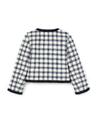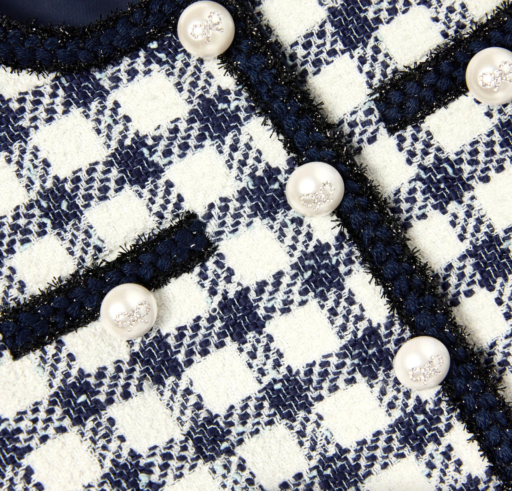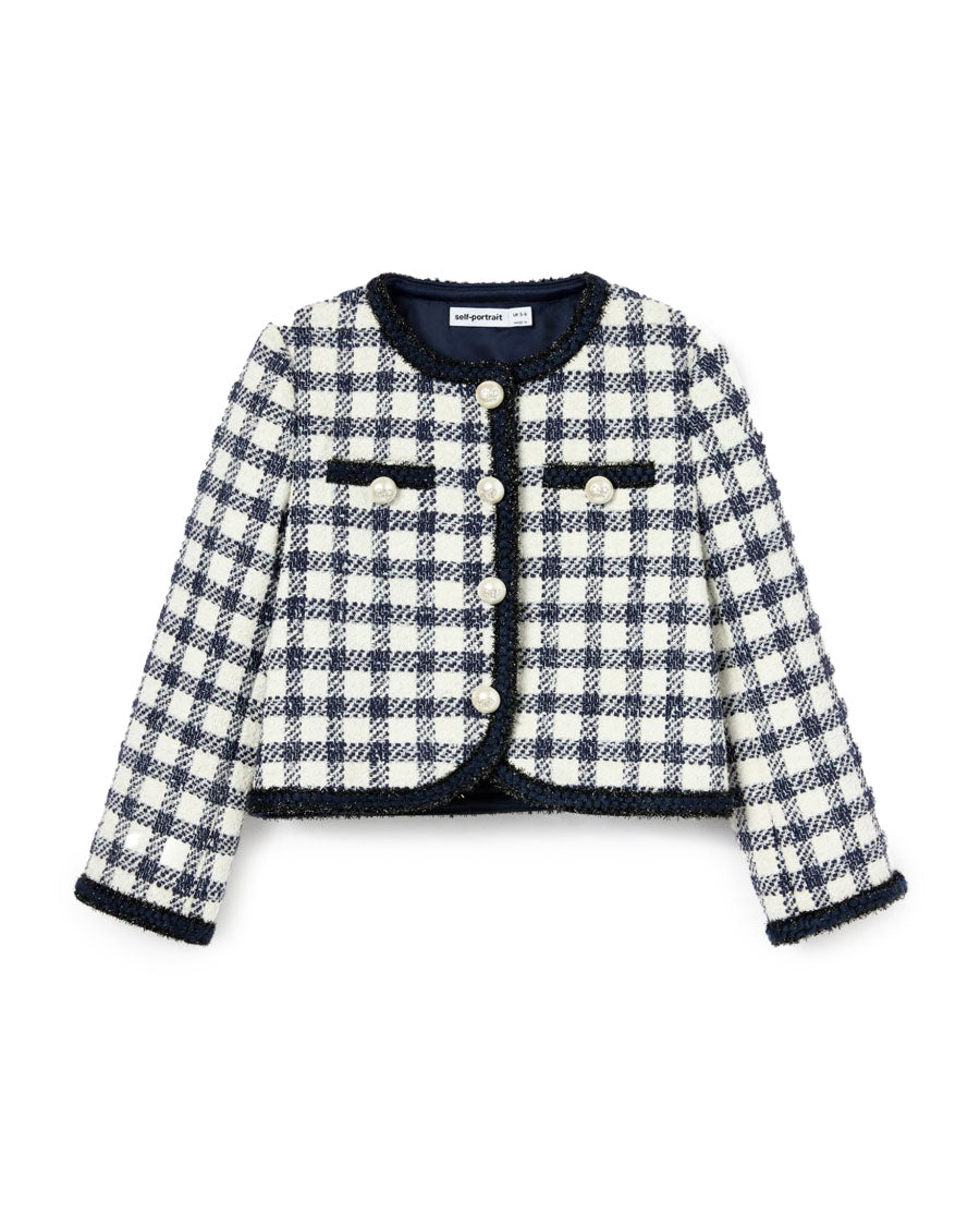 Preppy and polished, rich textured check bouclé will have mini-me looking super smart. Bow-topped pearl buttons are the cherries on top – style with our matching skirt for a ritzy afternoon tea.