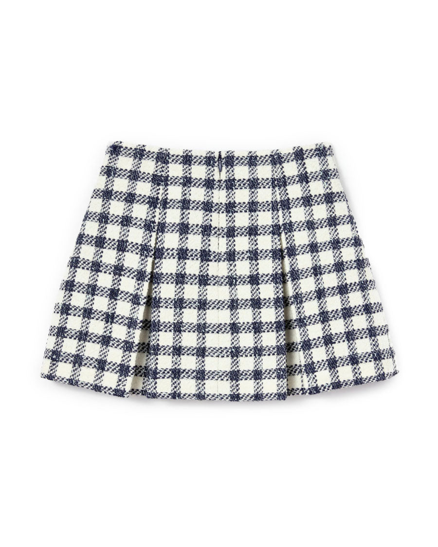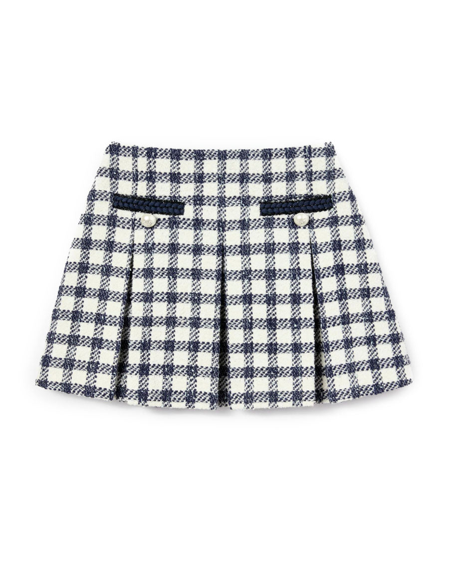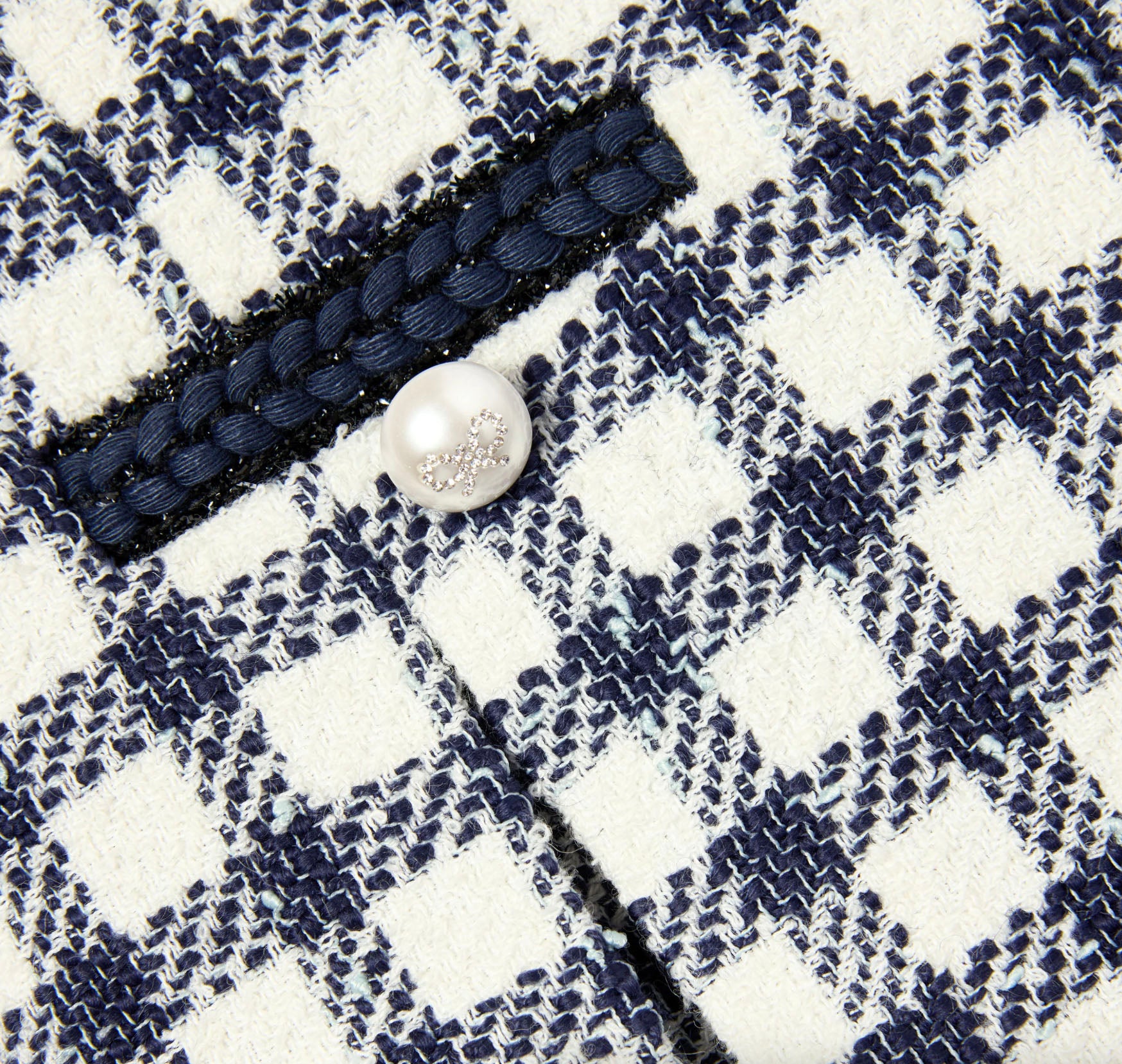 A classic with a ritzy twist, this navy check bouclé skirt boasts bow-topped pearl buttons for extra polish. Wear with a knit for day or add our matching jacket for a mini-me take on the skirt suit.