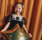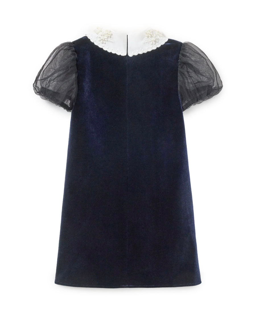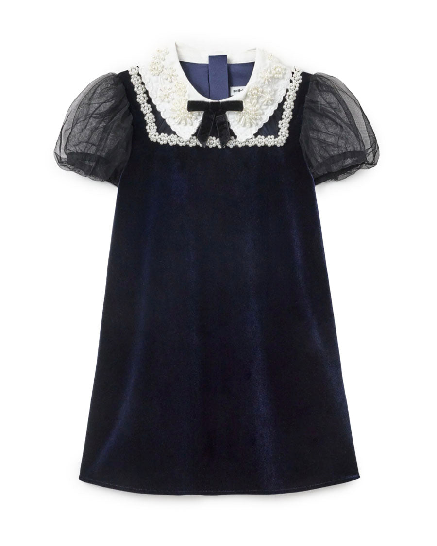 The pearl-topped contrast collar frames this velvet mini dress to delightful effect. A bow motif and sheer balloon sleeves lend extra charm – style with Mary Janes for parties and play dates alike.
