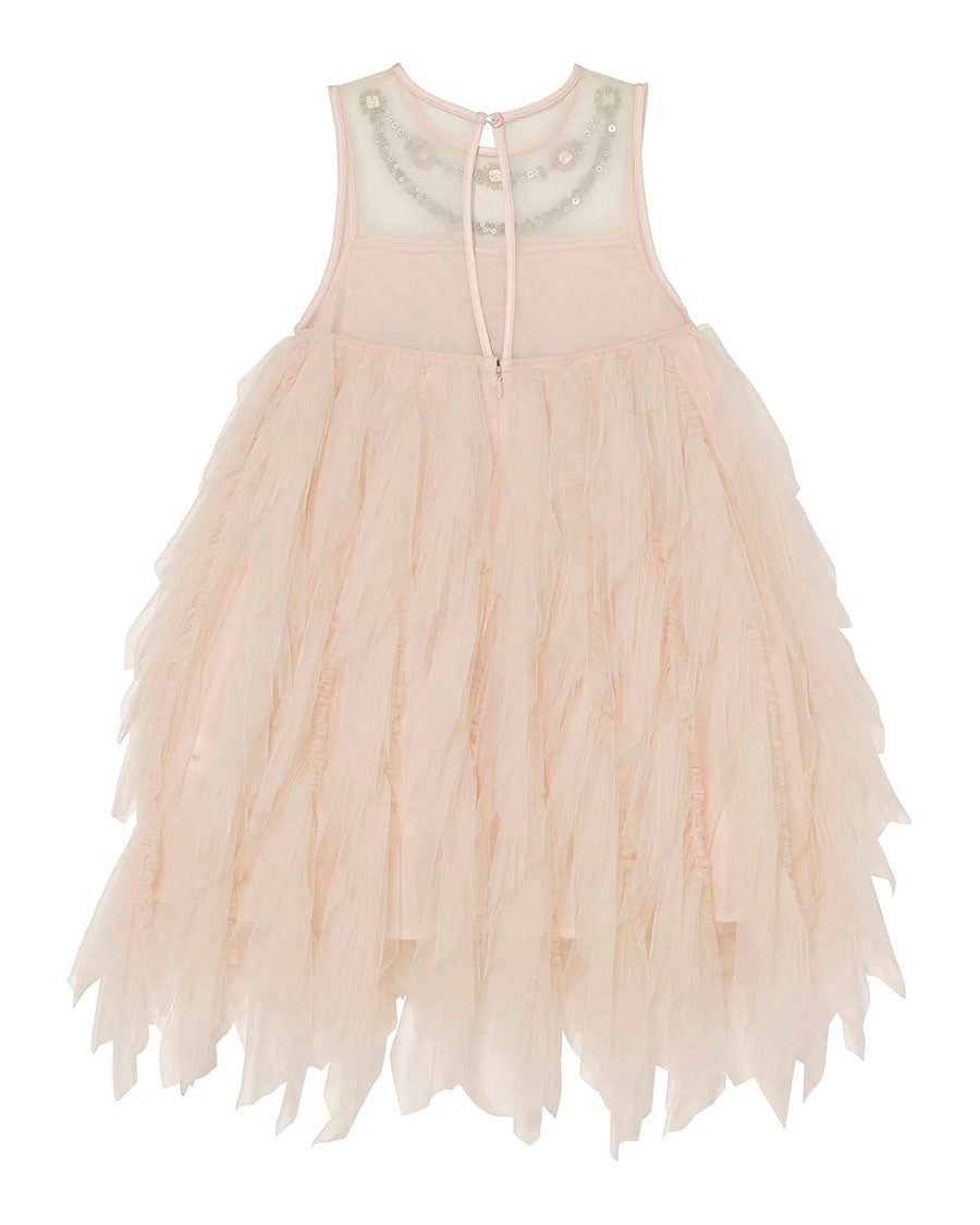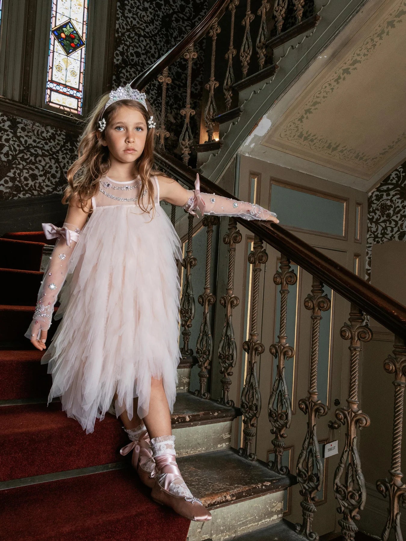 The Gilded Splendor Tutu Dress in Pearl is for the little girl who loves to embrace the magic of the moment. With its cascading waterfall-feathered tulle skirt, where every twirl tells a story, the A-line design ensures comfort without compromising on elegance. The front yoke, sparkling with crystals, resembles a beautiful necklace, adding an extra layer of magic. The sheer back yoke provides a delicate touch, making this dress as comfortable as it is enchanting.