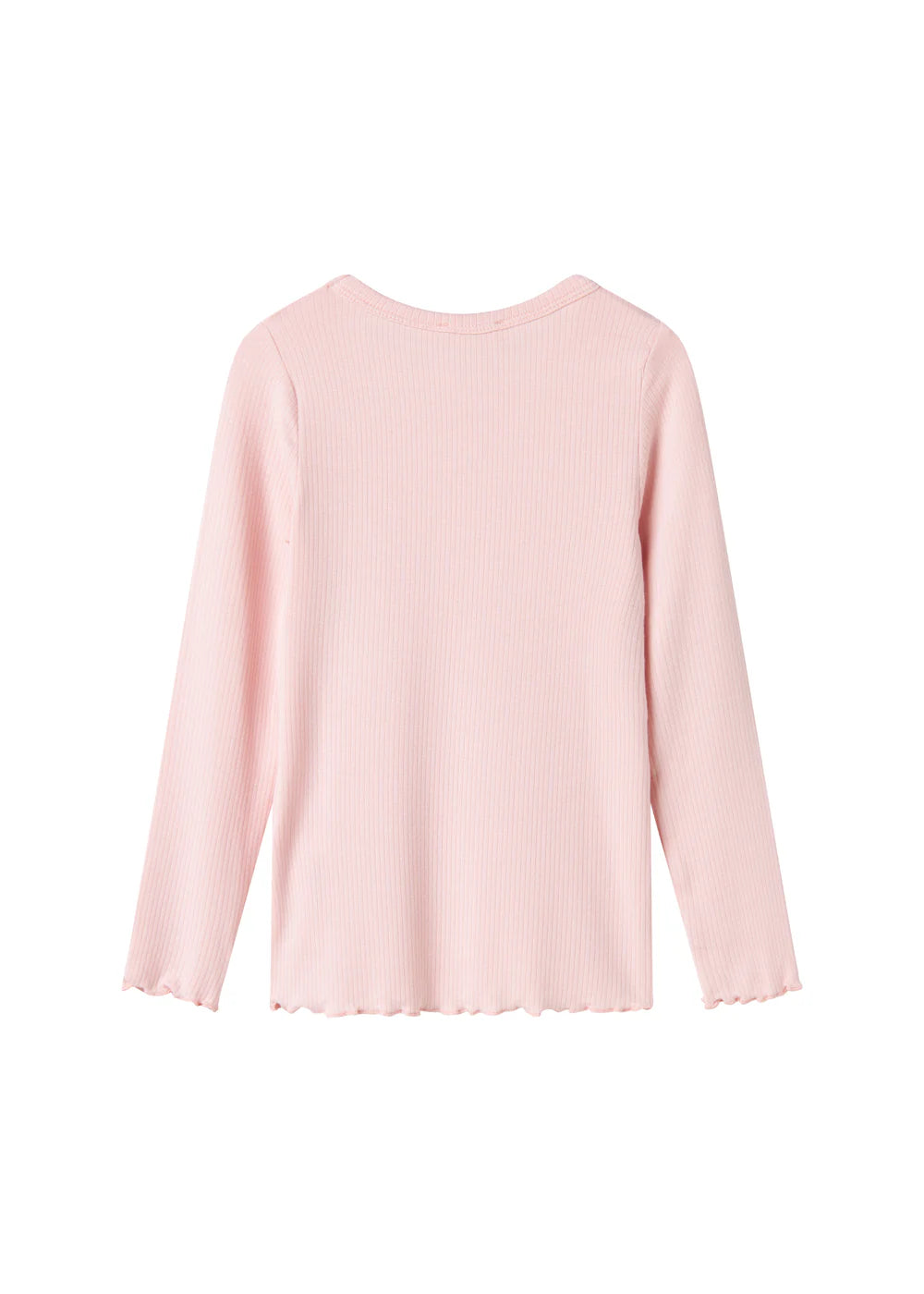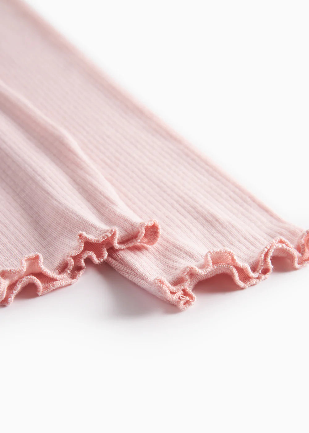 Simple long-sleeved t-shirt with ruffled edges on the sleeves for children. The t-shirt is soft, stretchy and comfortable to wear.