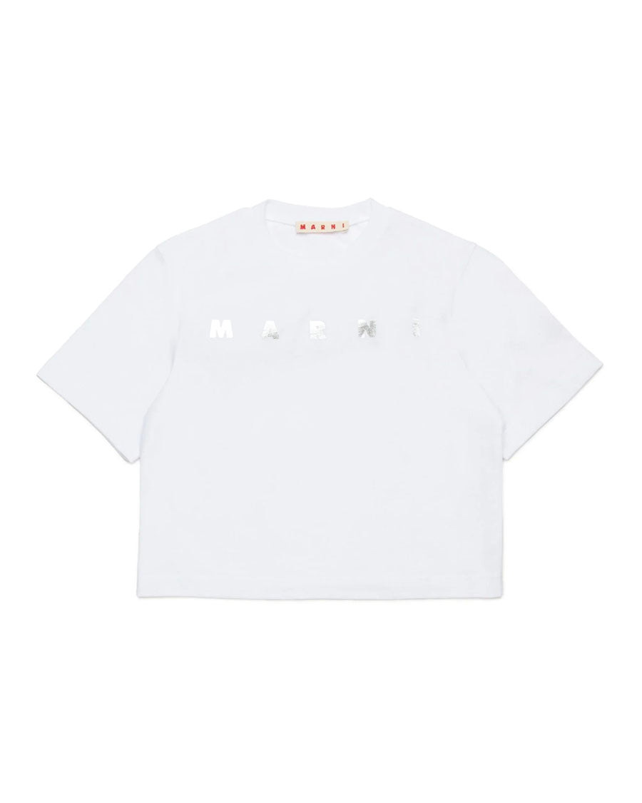 Cropped crew-neck T-shirt in short-sleeved jersey. Institutional logo printed in contrasting color on the front. Made of 100% cotton.
