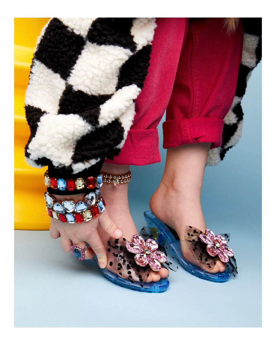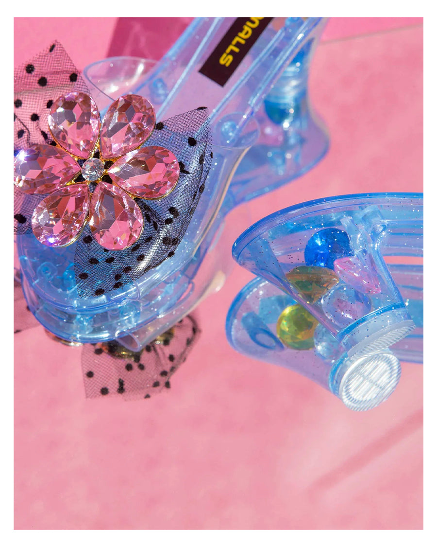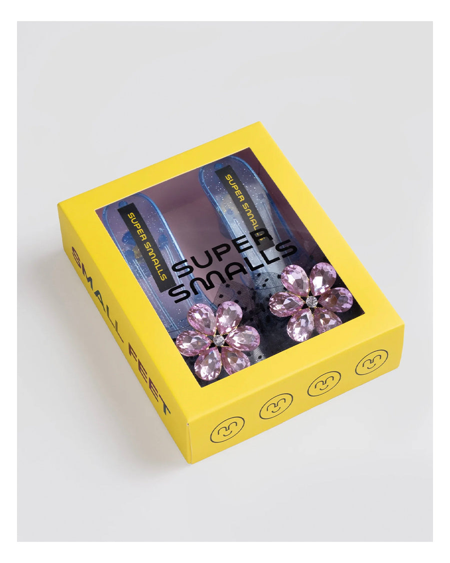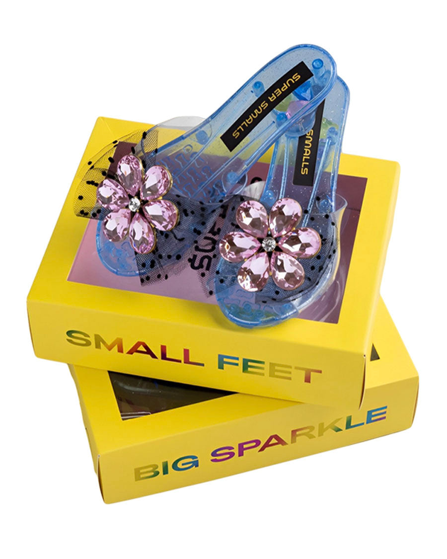 Fashion May Be a Serious Business, but These Shoes Are Made for Play!Ready for your Broadway debut? Our Opening Night Play Shoes are perfect for playtime! These sparkly blue kitten heels are just begging for a spin at the after party. Complete with an oversized flower jewel, black tulle bow, and colorful gems in the heel (that jingle while you walk!), your dress-up chest just got a Super fashion-forward upgrade. Made by Super Smalls.