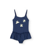 A graceful navy swimsuit with flying birds and a soft ruffled skirt, designed for imaginative swimmers seeking comfort, beauty, and truly unique kids designer clothes. This piece is UPF +50 certified.