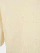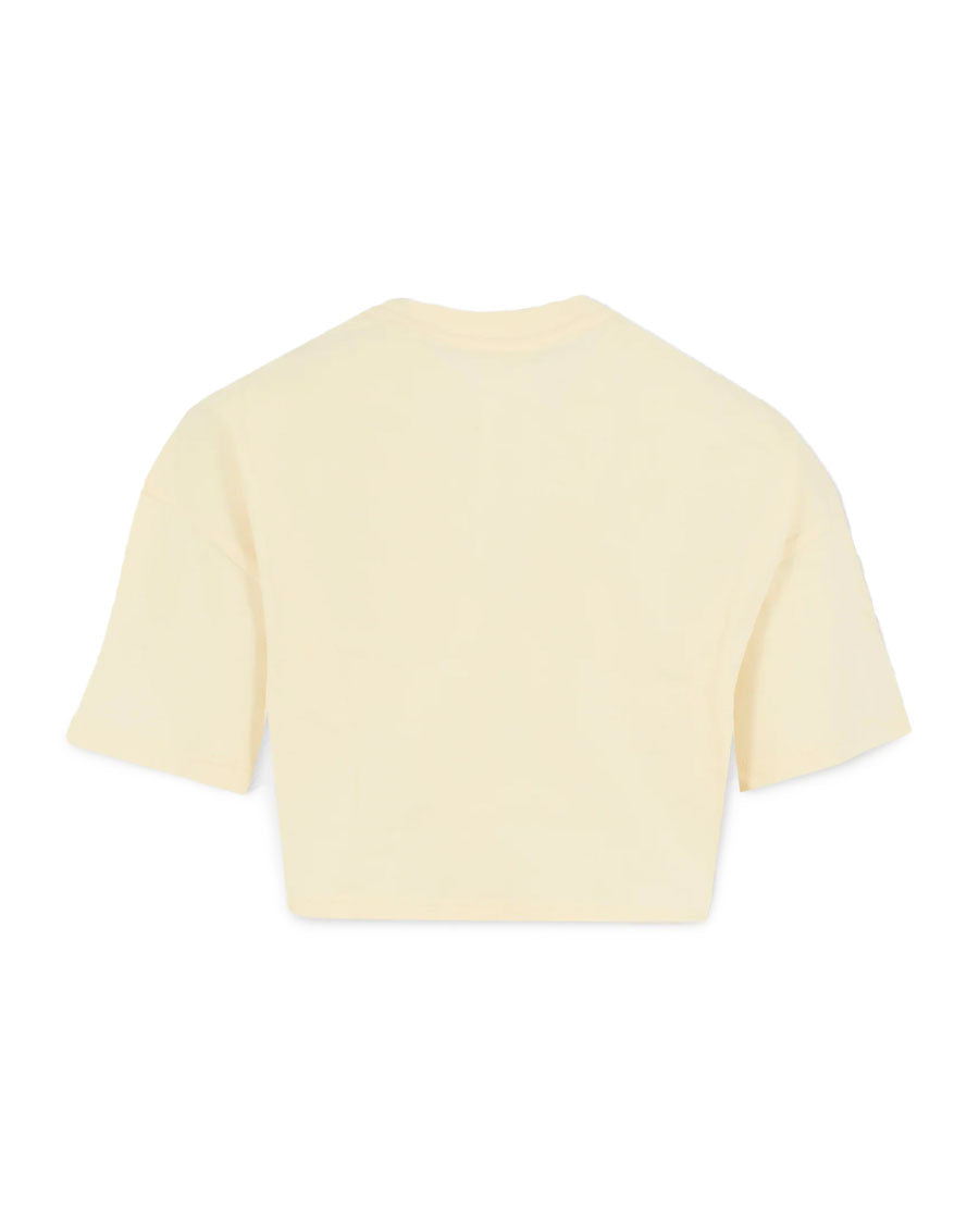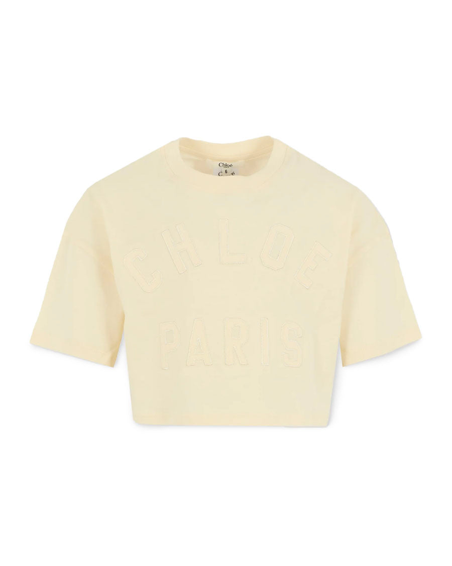 Ivory organic cotton crop t-shirt, with short sleeves and a ribbed crew neck. It is embellished with an embroidered logo on the front.