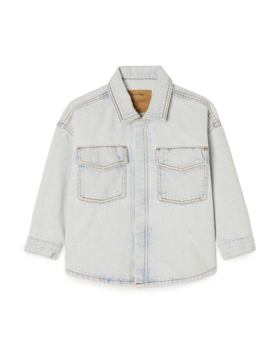 The Joybird denim shirt for kids, with its winter bleached wash, boasts a casual style with a touch of retro. Its faded look gives it a vintage feel, ideal for creating a casual outfit.