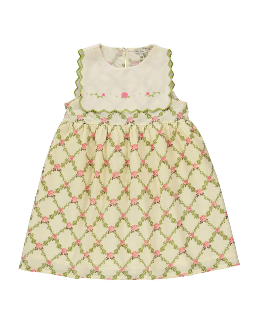Vintage-inspired Charlotte dress in nostalgic rose print in a truly beautiful sleeveless silhouette and vintage-inspired square collar with signature floral embroidery. Crafted from softest cotton. Back closure with a mother-of-pearl button.