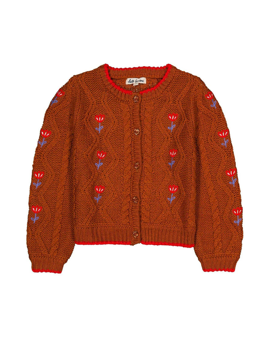 Cardigan in plain cable knit embroidered with flowers. Constrasted plain side edges. Slightly ballooned sleeve and gathers at the head of the sleeve. Buttons on front.
