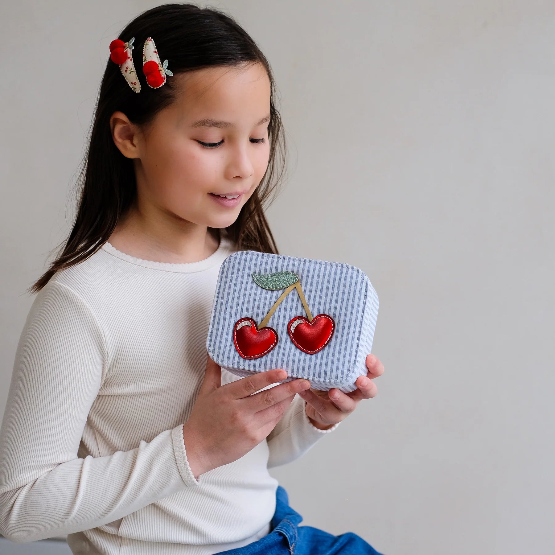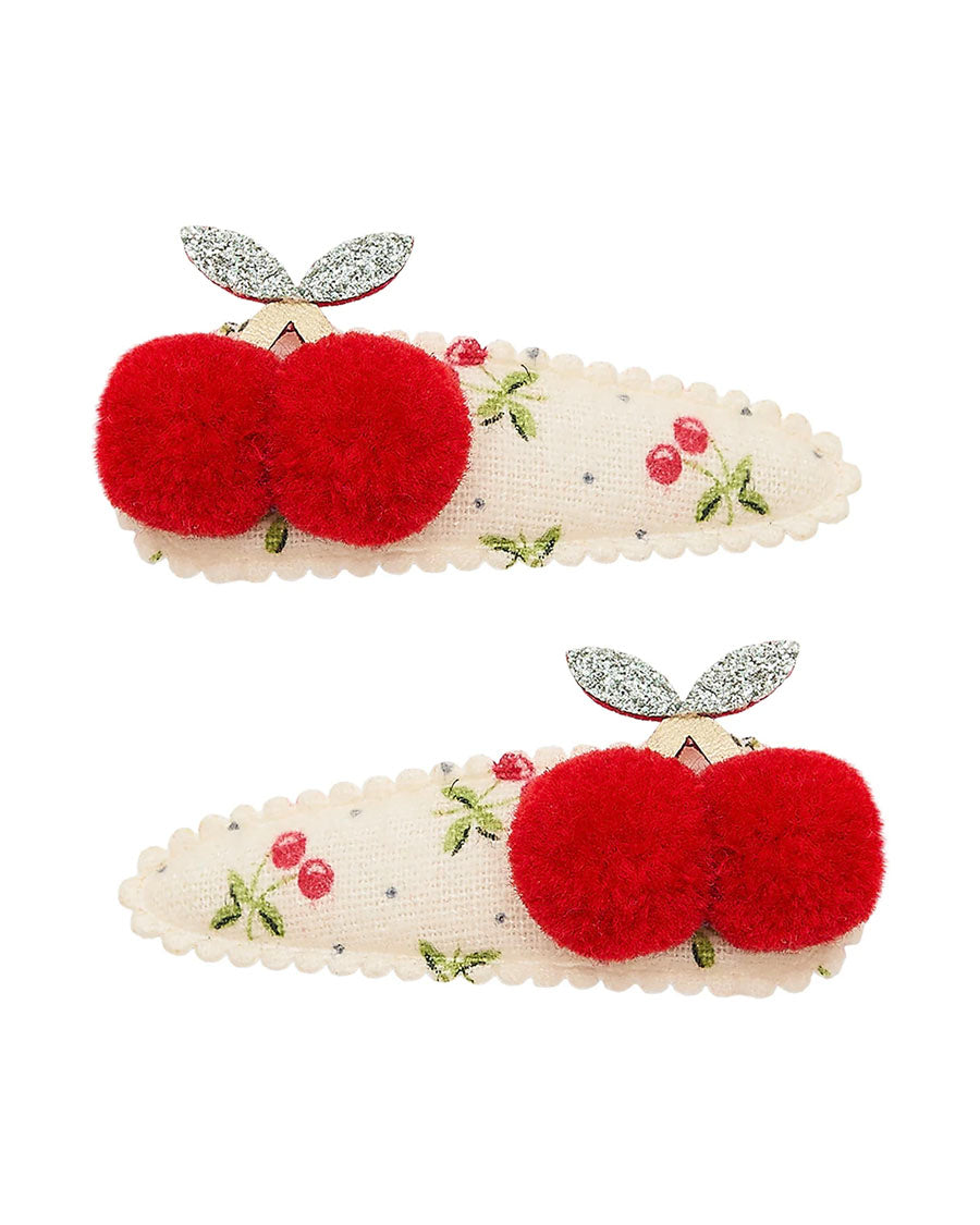 Add a fun and fruity twist to their hair with these adorable cherry clips, each topped with a pair of super soft, bright red pom pom cherries for a bright pop of cheerful charm!