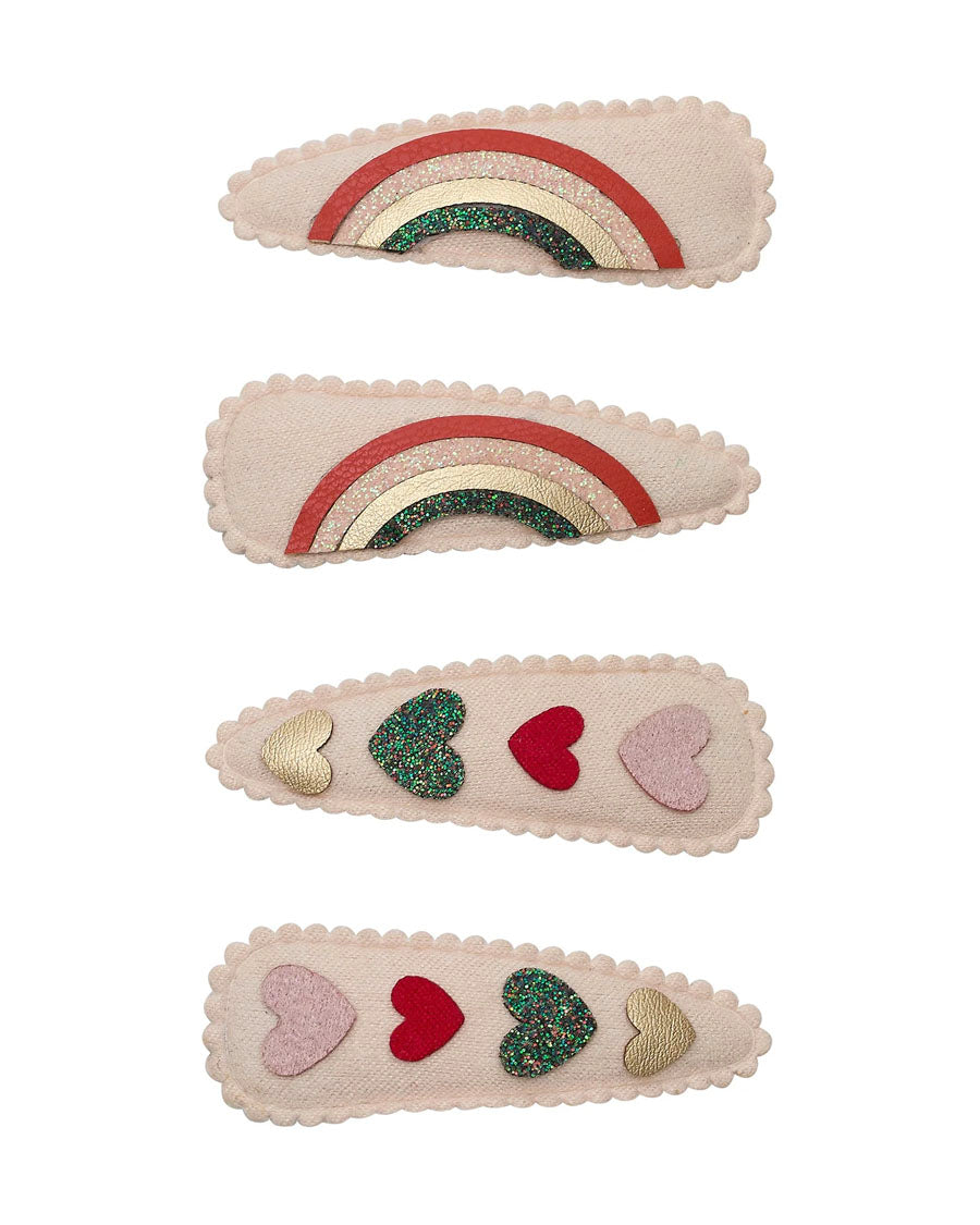• Hearts and rainbows crafted from a mix of glitter, soft suedette and metallic fabrics