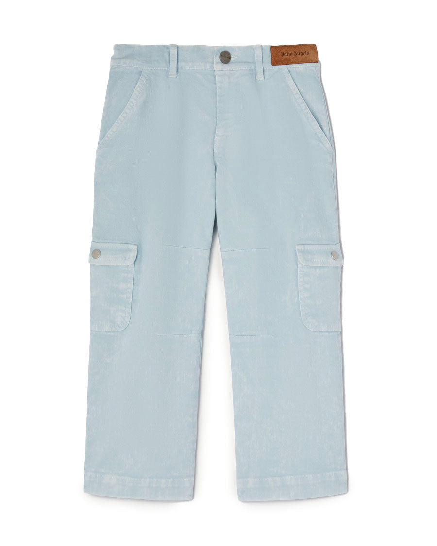 The summer season brings with it new treatments that introduce new print finishings. Girl's marble effect cargo pants in light blue and rose pink hues, with side flap pockets, back pockets with black Monogram patch and leather patch on the front.