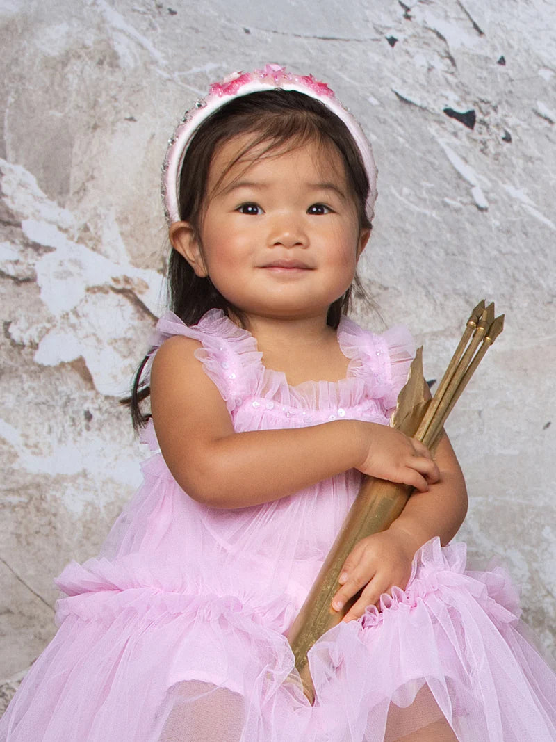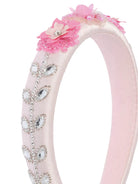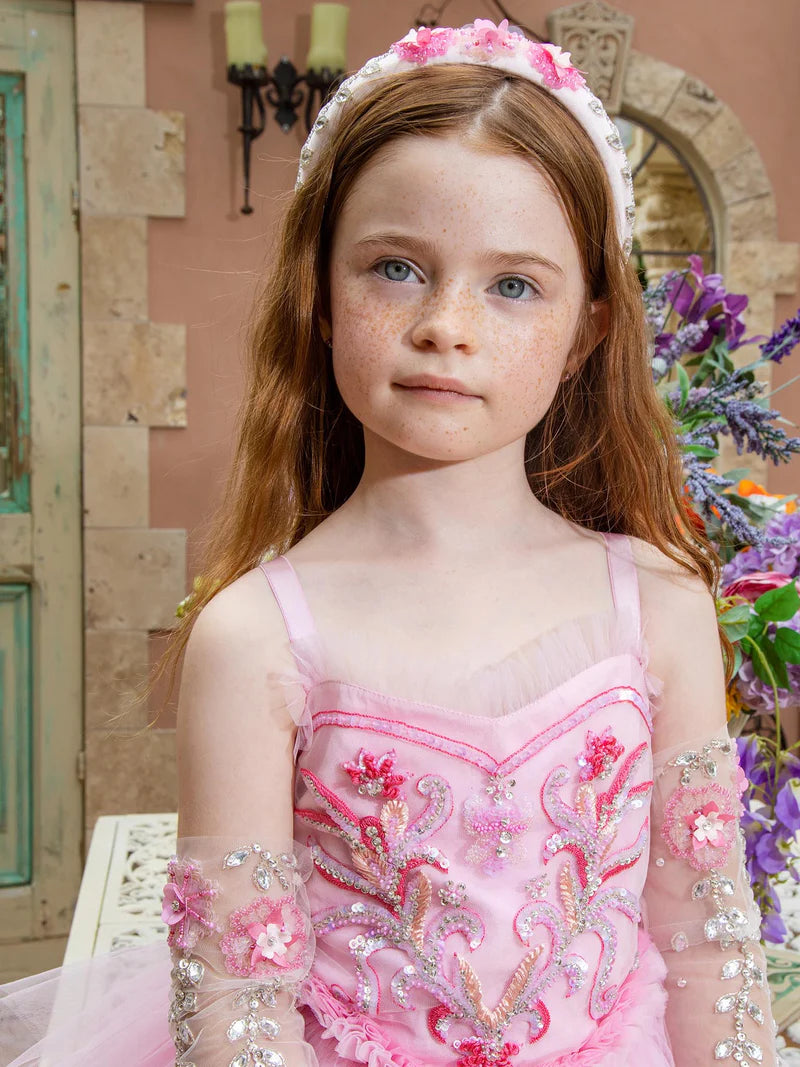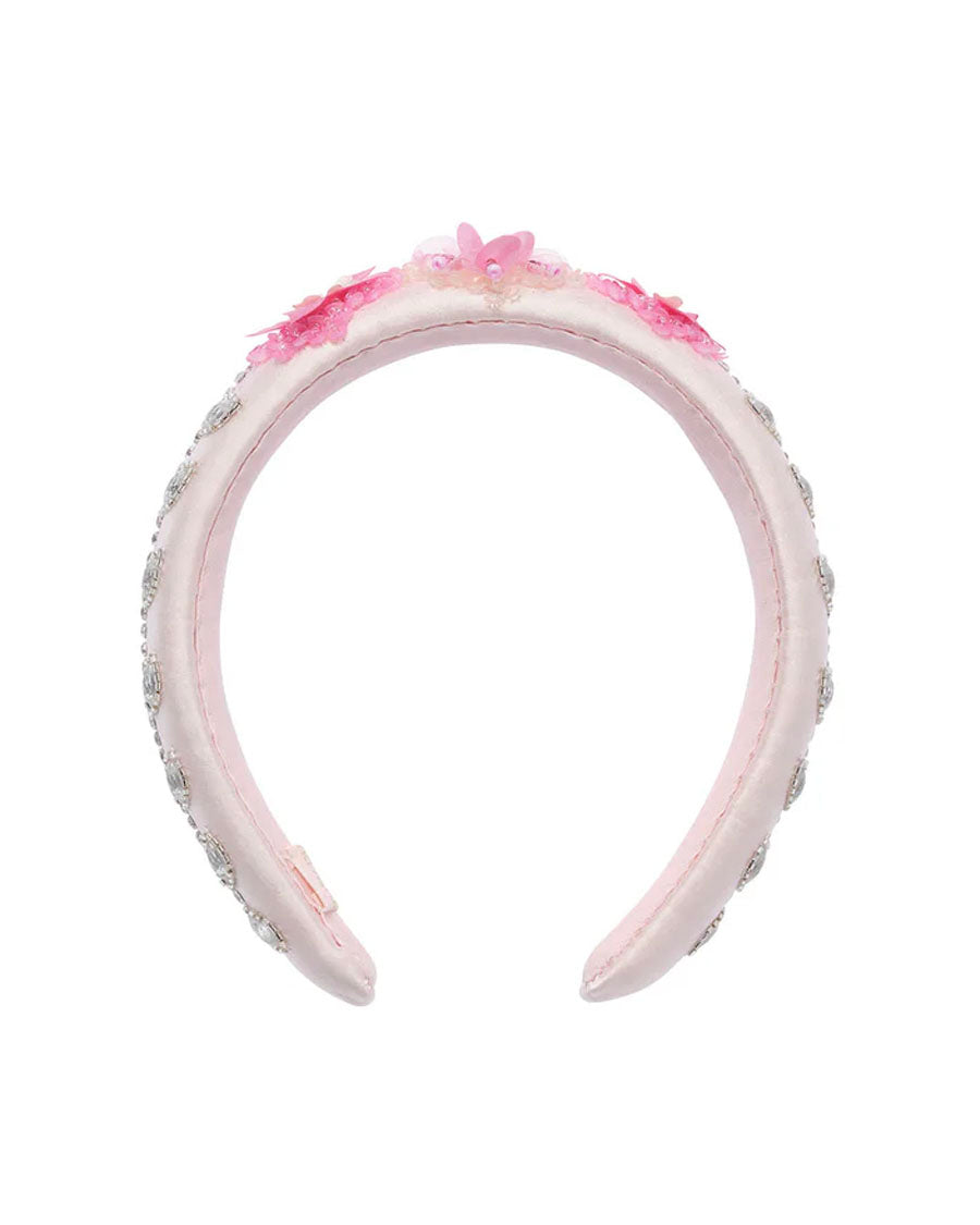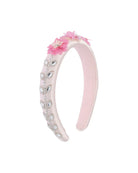 The Marina Fleur Headband in Satin Bow glimmers with beads and gems arranged in a delicate leaf pattern. At the crown, soft tulle flowers bloom, each adorned with a sparkling gem at its centre — a radiant accessory that feels like a crown of blossoms.