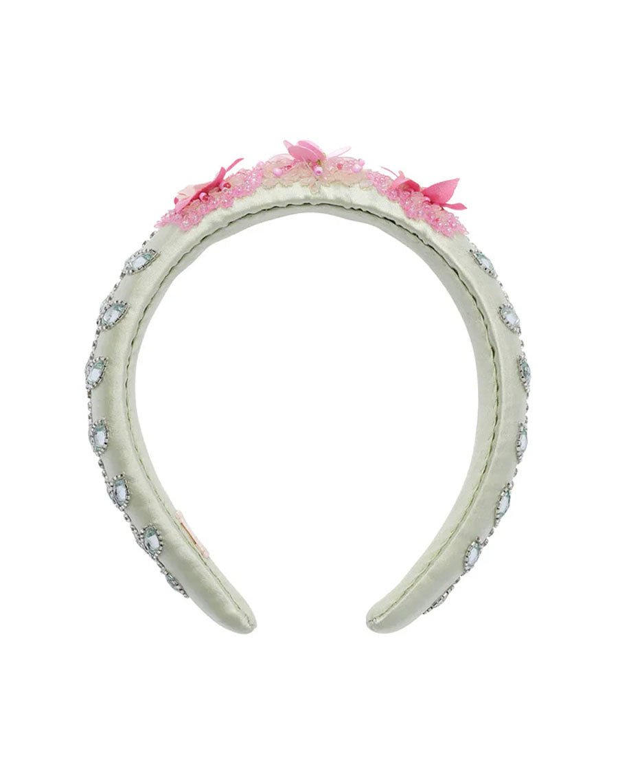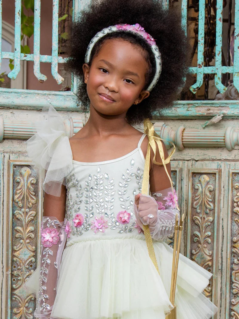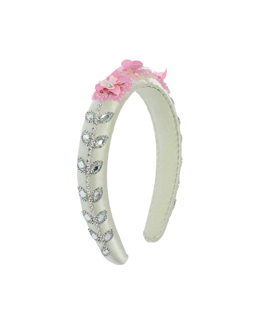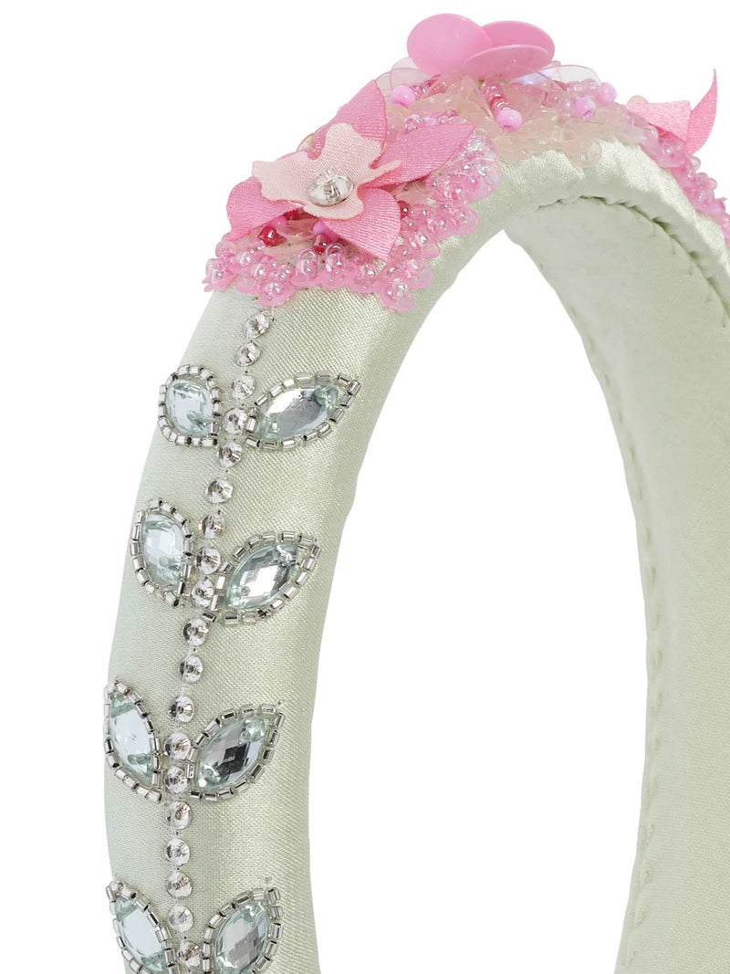 The Marina Fleur Headband in Fog Green glimmers with beads and gems arranged in a delicate leaf pattern. At the crown, soft tulle flowers bloom, each adorned with a sparkling gem at its centre — a radiant accessory that feels like a crown of blossoms.