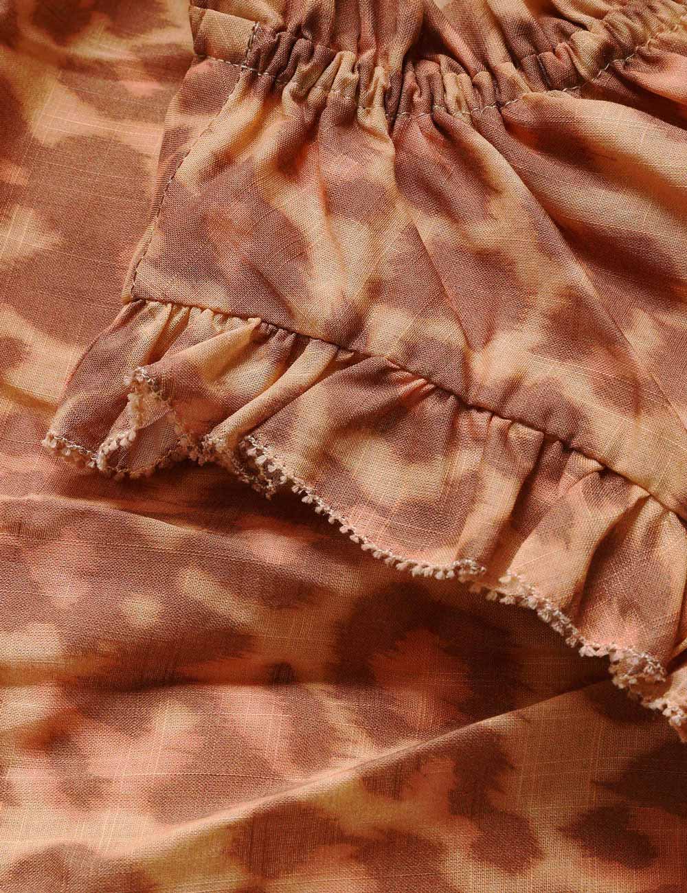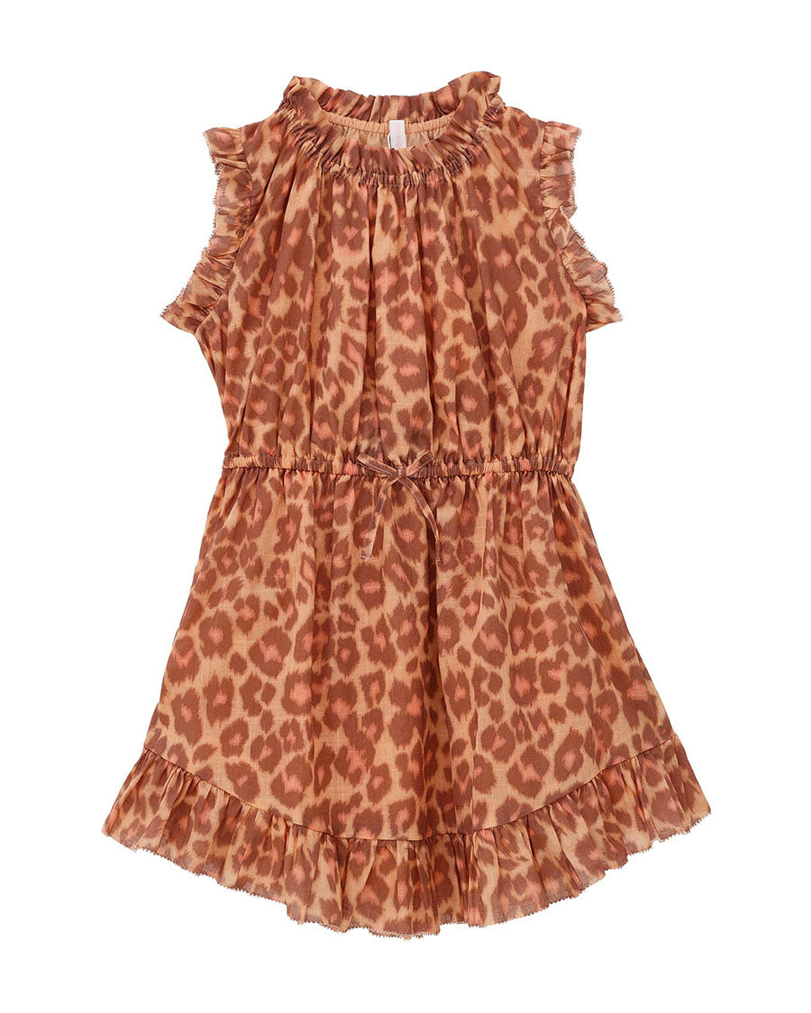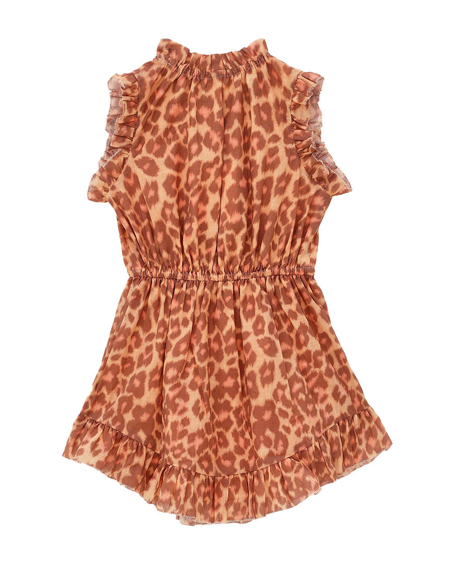 The Patience Kids Flip Dress in Tan Leopard from our Resort Swim 2026 Collection. A kids cotton dress featuring a stand collar, fixed bow waist-tie and frill edges throughout.