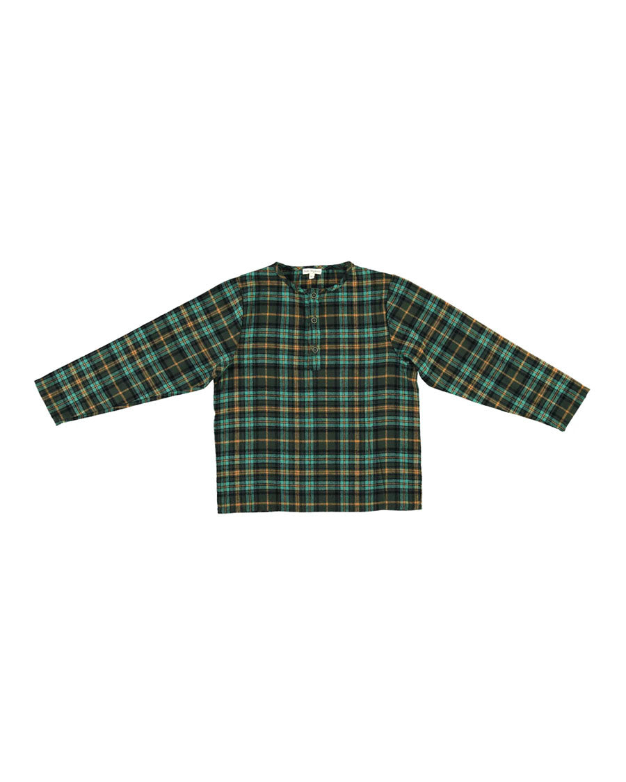 Celebrate the festivities with an adorable Sebastian shirt in tartan check in gorgeous dark green, light green, and contrasting yellow colours. Made from the softest cotton, this shirt features a front opening with wooden buttons, round collar, long sleeves, and comfortable loose fit. Perfect for first Christmas celebrations and family pictures.