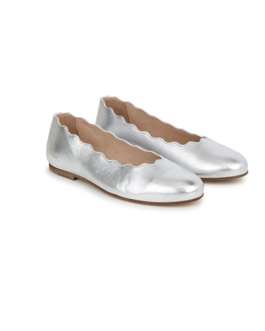 Inspired by the Maison's main shoe collection, these Lauren ballerinas for girls are crafted from silver cowhide in a soft, rounded silhouette that showcases the Maison's iconic scalloped trim along the upper. The embossed Chloé logo at the heel lends a signature touch.