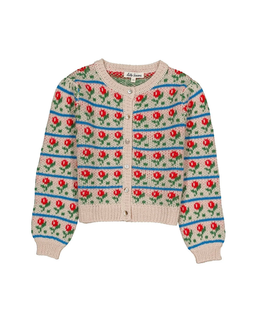 All-over jacquard knit cardigan. Plain ribbed edges. Slightly balloon sleeves and gathers at the head of the sleeve. Buttons on front.