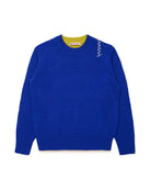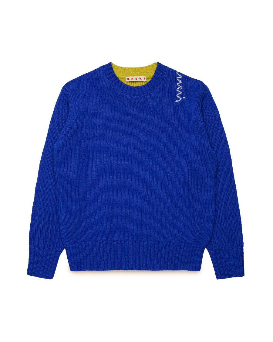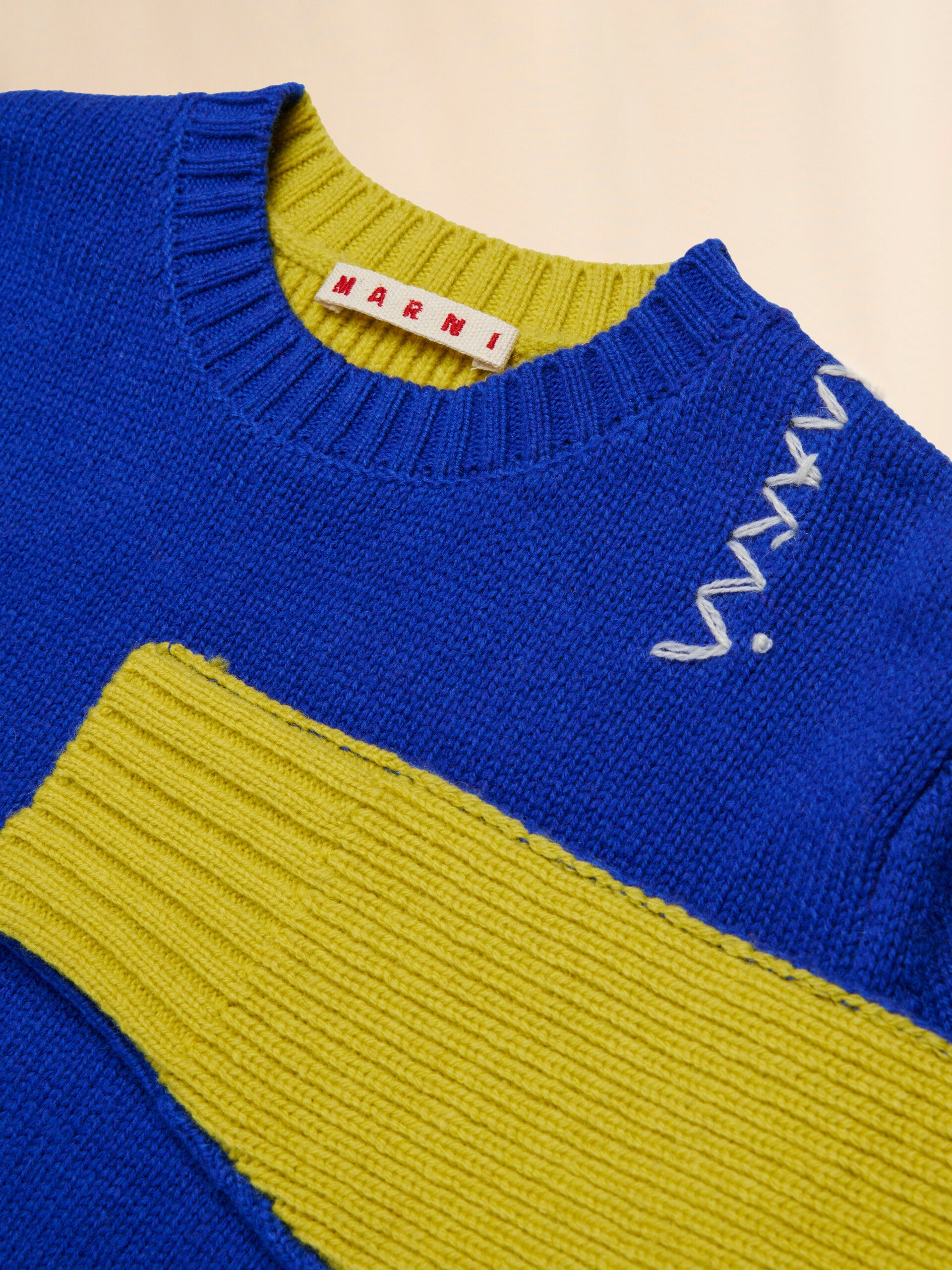 Crew-neck sweater knitted from a wool and nylon blend. Half-and-half design with back in a contrasting knit and colour. Chunky ribbed trims. Hand-stitched Marni Symbol on the shoulder.