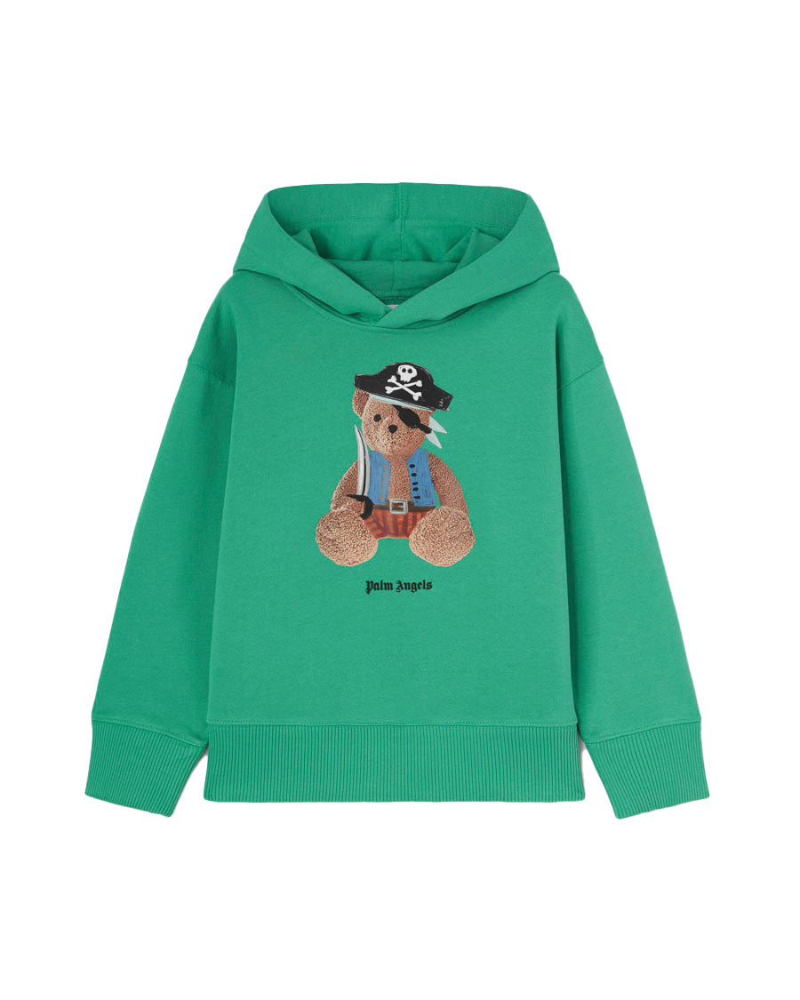 Discover new exclusive prints for the SS25 season inspired by the imaginary Palm Island and its many characters. Boy's green hoodie with pirate bear with eye patch and three-pronged hat printed in full color on the front and logo Palm Angels screenprinted in black underneath.