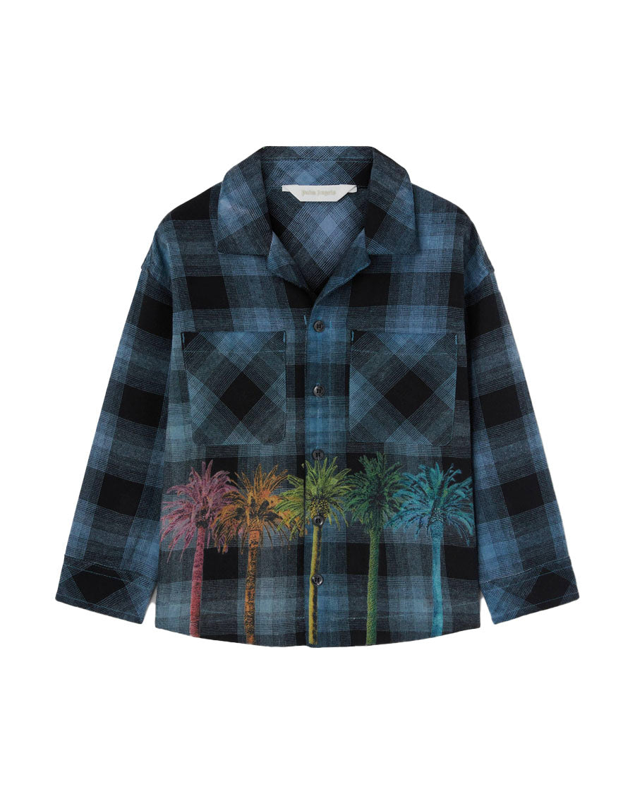 Checks in summer: beyond the seasons with a grunge feel and a unique finish. Boy's powder blue plaid flannel shirt with open collar and multicolored palm trees digitally printed on the front and a flou yellow Palm Angles logo printed on the back.