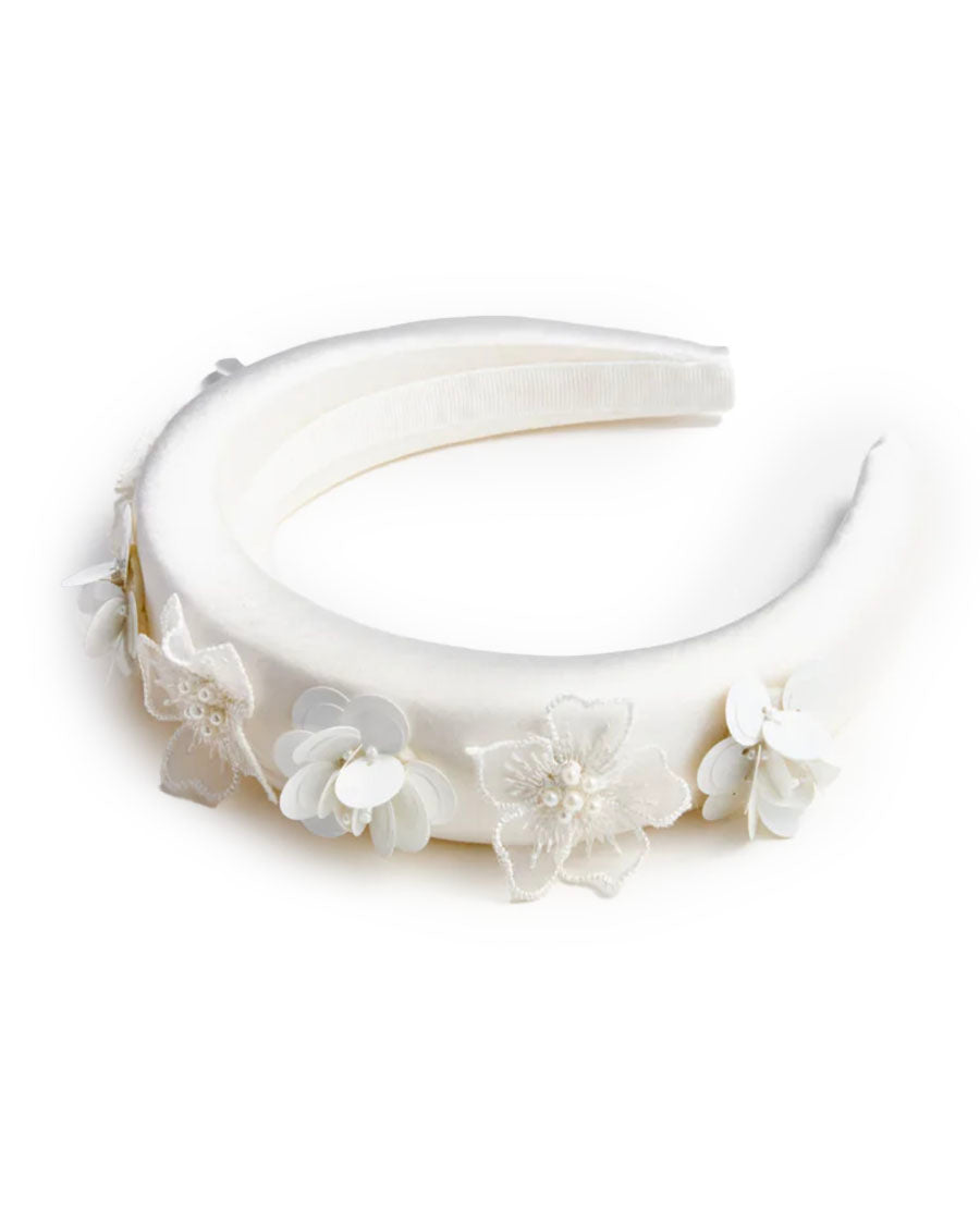 Heads up: this headband's cream satin make-up and floral embellishments make it the perfect finishing touch for candy-coloured looks.