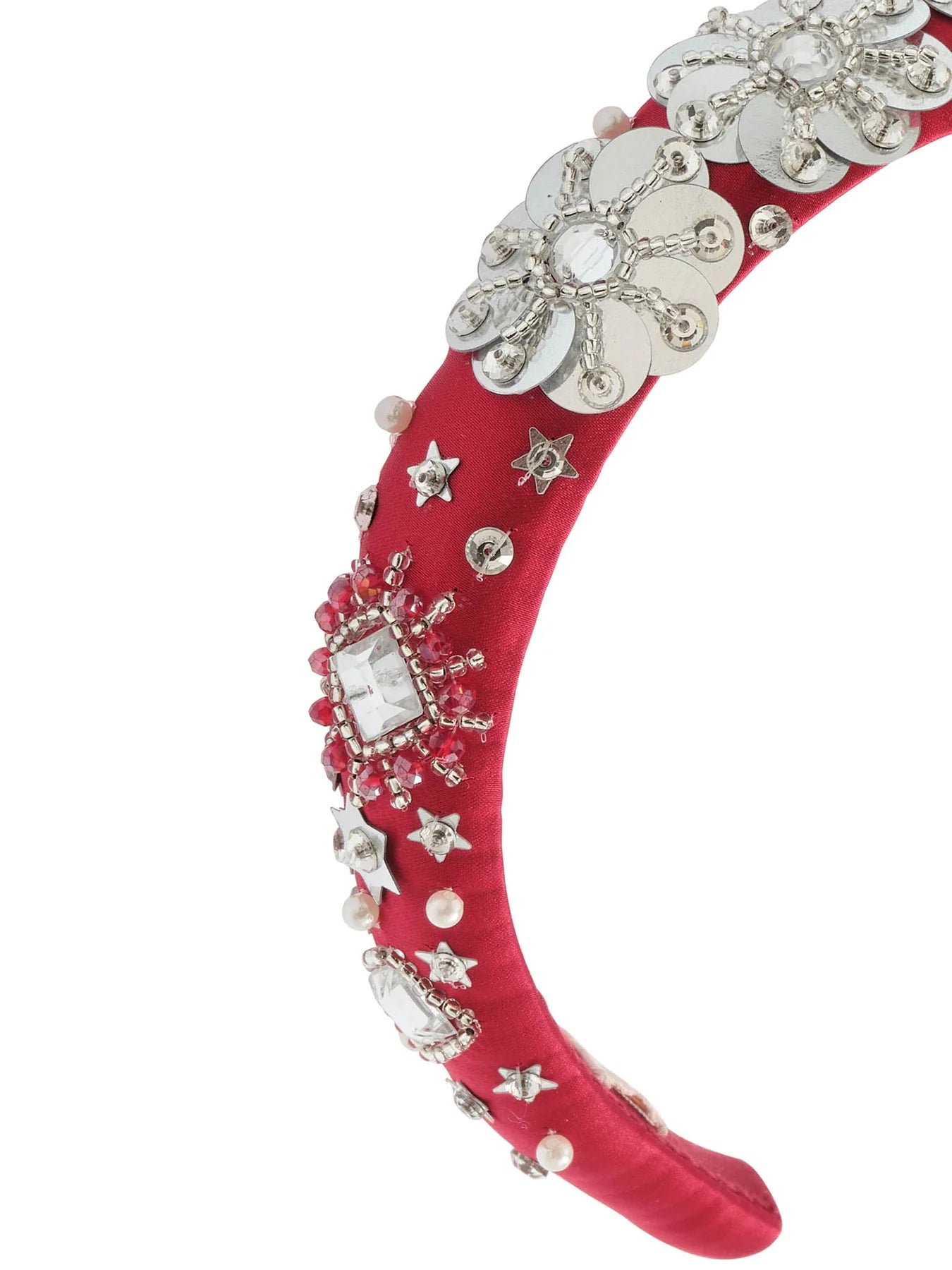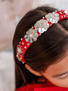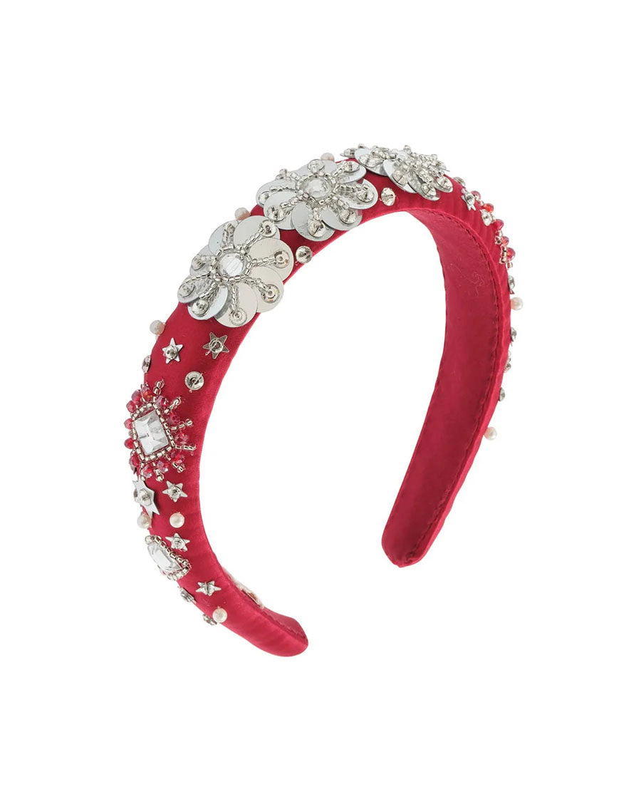 Celebrate the season with the Grande Marche Headband in Red Velvet! Adorned with shimmering silver embellishments, this headband adds a vibrant touch of Christmas cheer to any outfit