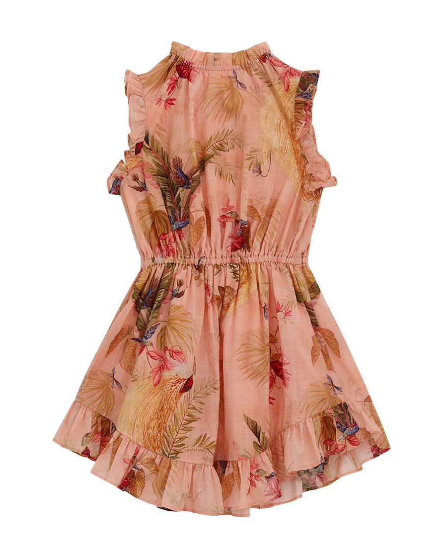 The Rhiannon Kids Flip Dress in Pink Palm Floral from our Summer Swim 2025 Collection. A cotton flip dress featuring a playful flip hem with gathered frill neckline and sleeves.