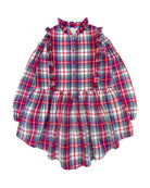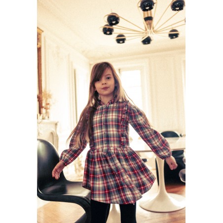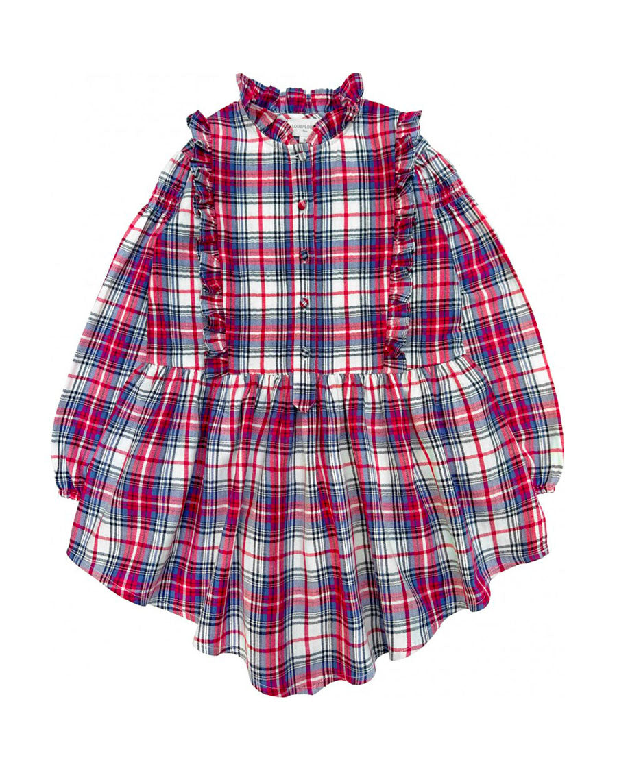 Details: Ruffled collar, skirt with V-shaped cut at the front and back, button placket on the front.