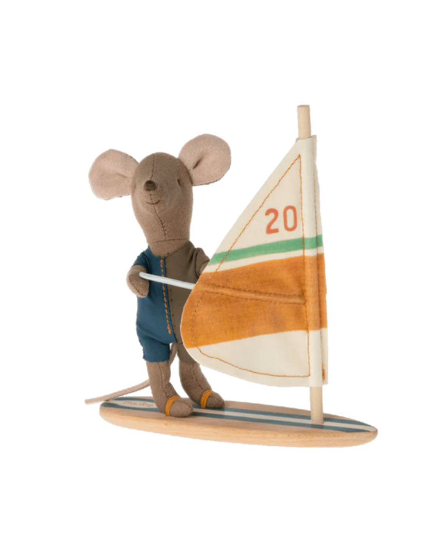 Little brother is learning how to surf alongside his sister! He’s wearing a half n half colored wetsuit that is dusty blue and forest green. His surfboard is dusty blue and off-white striped and his sail matches his sister marked with #20. The surfboard includes two elastic straps at the bottom so he can keep his feet in place. He also has magnetic hands, so he can steer his sail wherever he wants to go! Made by Maileg