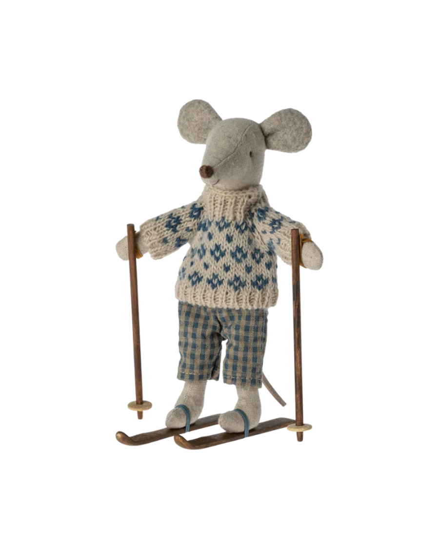 A mouse ready for hours of fun on the slopes during the cold wintertime. Each playset contains a warmly dressed mouse with a pair of ski and poles. A funny detail is the ears which are made so they look like the mouse is wearing ear warmers.
