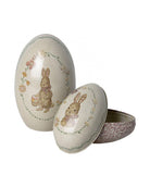 A set of 2 Metal Easter eggs, with the smaller egg nested inside the larger (2 eggs total). The decoration on the eggs is Dorthe Mailil's personal embroidery which was made into a beautiful print on the eggs. Large Egg 14 cm / Small egg 11 cm