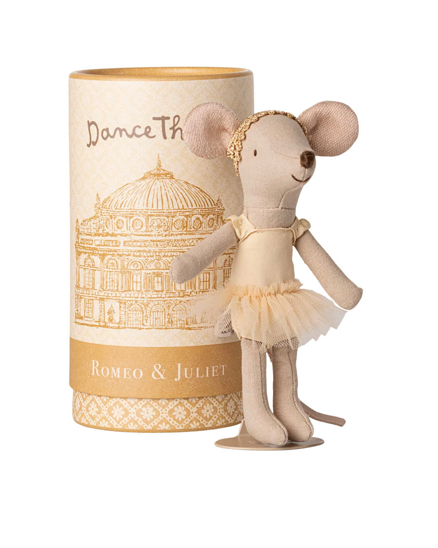 This ballet dancer mouse is the star of the stage! Dressed in a delicate tutu and golden tiara, Big Sister is ready for her grand performance in Romeo and Juliet. She arrives in a beautifully decorated tube and comes with a metal stand, so she can perform wherever you wish. Her magnetic paws allow for a graceful dance rehearsal with her partner.