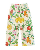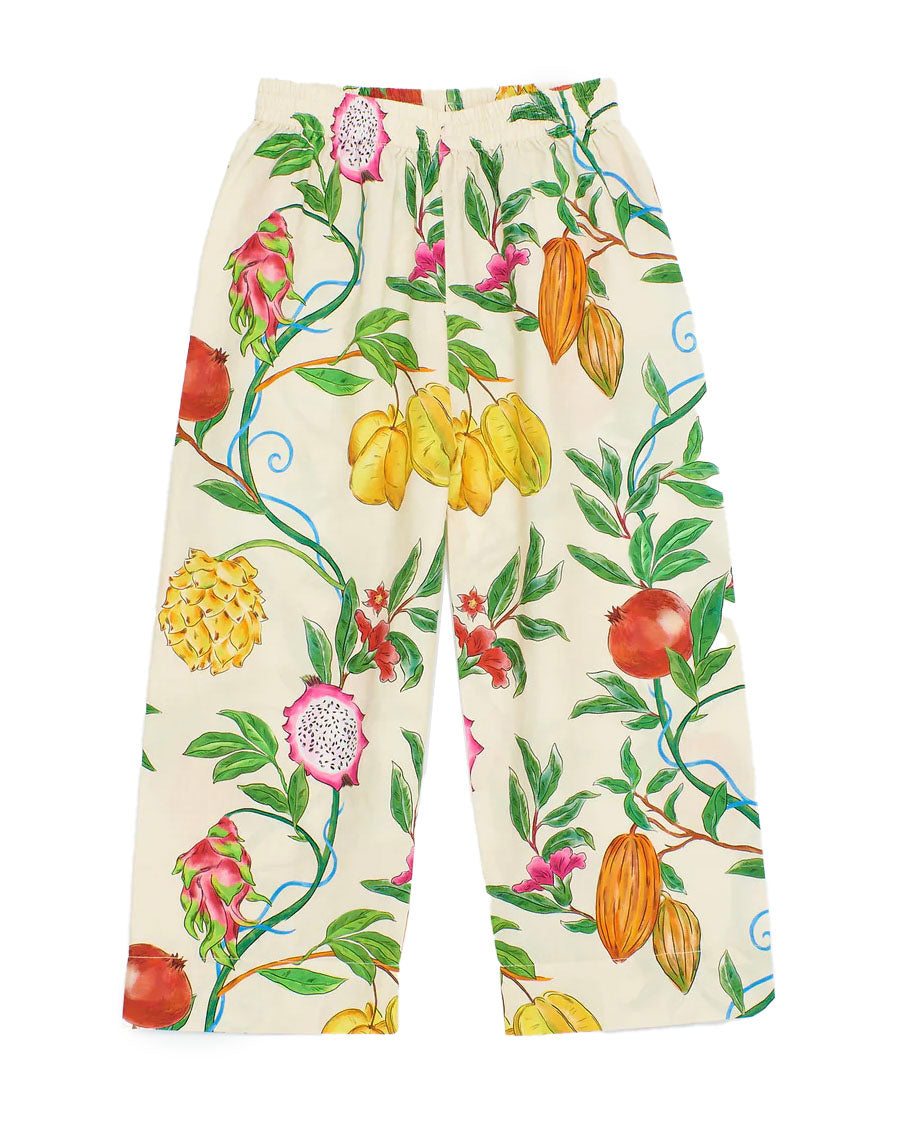 The Passion Fruit trousers in cloudy white are fresh cotton trousers in a relaxed fit, featuring an allover passion fruit print. They have an inner elastic waistband for better comfort.