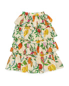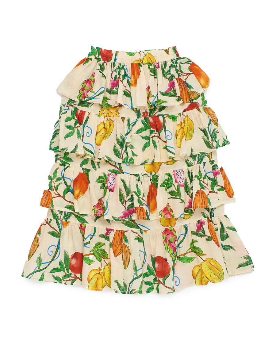 The Passion Fruit skirt in beige is a fresh cotton long skirt with multiple ruffles and an allover passion print. It has an elastic waistband for better comfort and adaptability.
