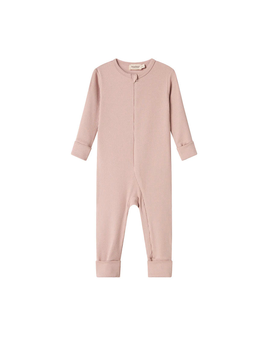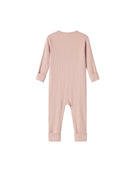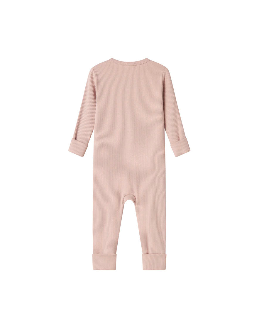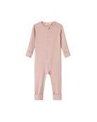 Simple long-sleeved jumpsuit that can be zipped all the way from the neck down one leg with a zipper for easy diaper changes. The jumpsuit has pleats at both sleeves and legs, which can be adjusted as the child grows. The jumpsuit also has a foldable mitten/sock function from size 2-4M. The jumpsuit is ribbed, soft, stretchy and comfortable to wear.