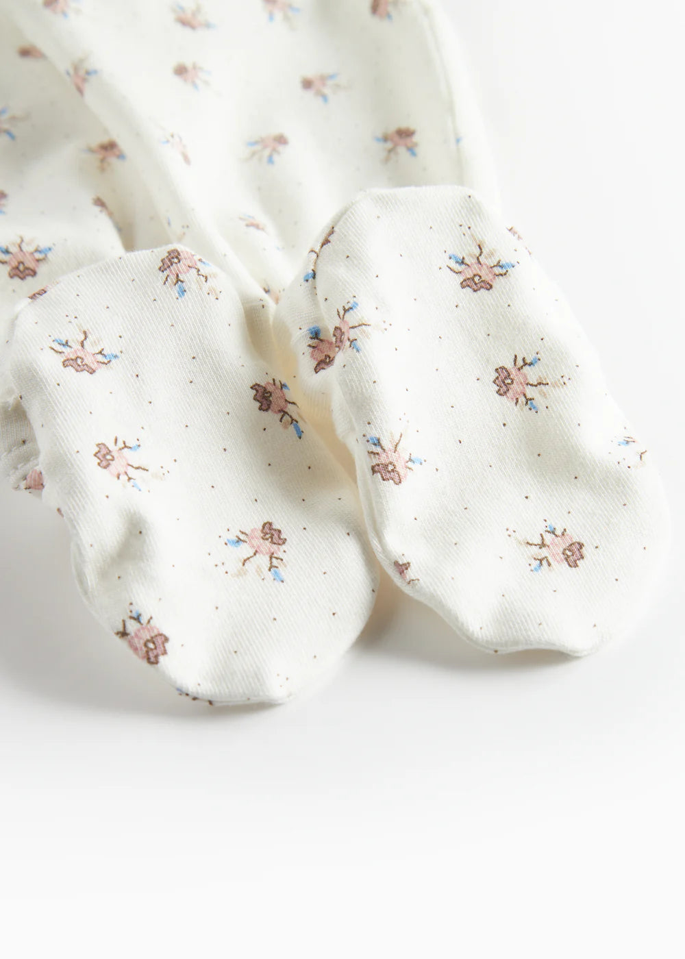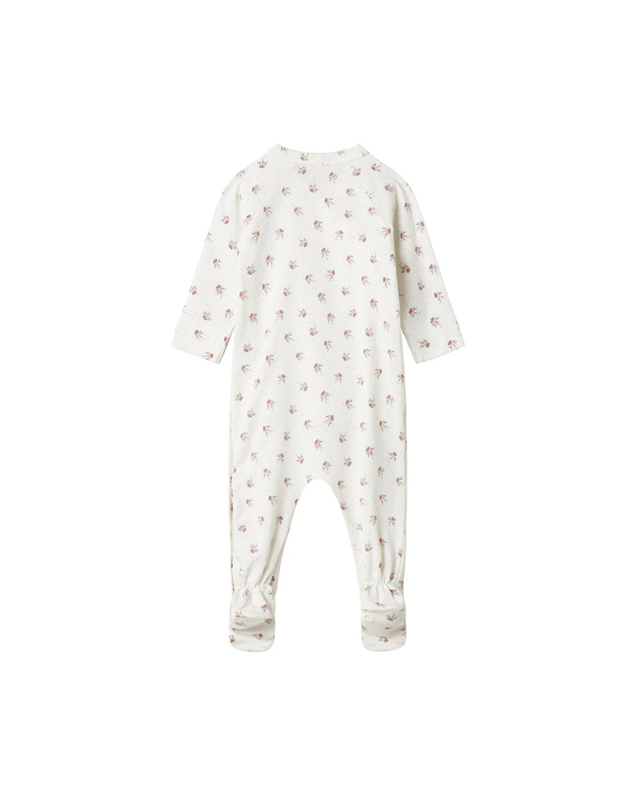 Long-sleeved jumpsuit with feet for newborns. The jumpsuit has a wrap-around closure and closes with snaps and ties from the neck down one leg. The jumpsuit has a nice print and is both soft, stretchy and comfortable to wear.